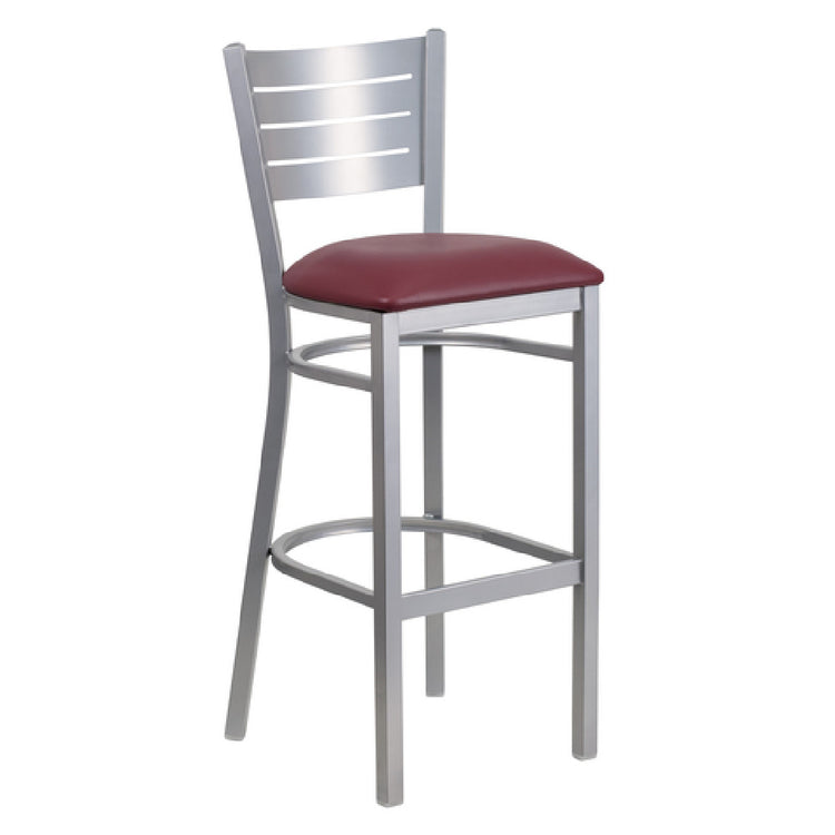 The Flash Furniture XU-DG-60402-BAR-BURV-GG Hercules Series Restaurant Bar Stool is a meticulously designed seating solution tailored for commercial environments. It features a distinctive metal cutout slat back, offering both aesthetic appeal and functional support. The bar stool includes a 2-1/2" thick burgundy vinyl upholstered padded seat, constructed with CA117 fire retardant foam, ensuring comfort and safety. The welded joint assembly enhances durability, making it suitable for high-traffic areas. With two curved support bars and a footrest, this stool provides added stability and comfort. The frame is crafted from 18-gauge steel with a silver powder-coated finish, ensuring robust construction and resistance to wear. Designed with practicality in mind, it includes plastic floor glides to protect flooring surfaces. This stool is ideal for businesses that require reliable and stylish seating options, with its assembly requirement offering convenience for transport and storage. In-stock items typically ship within 24 hours, making it a practical choice for restaurant owners and other commercial establishments in need of efficient and dependable seating solutions. The Flash Furniture Hercules Series Bar Stool exemplifies a blend of durability, comfort, and style, catering to diverse market needs within the hospitality industry.