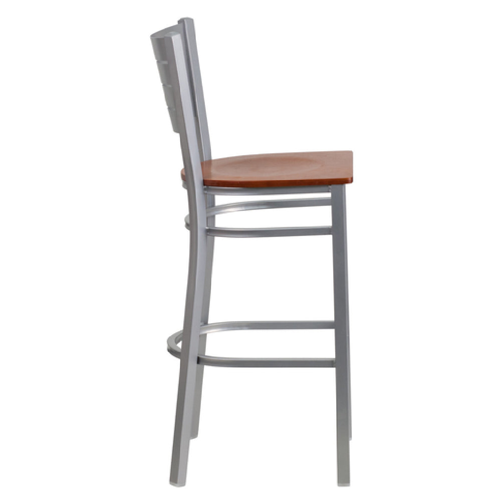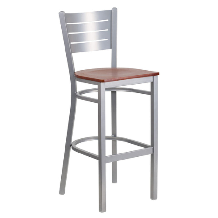 Flash Furniture XU-DG-60402-BAR-CHYW-GG Hercules Series Restaurant Bar Stool is a thoughtfully engineered seating solution, ideal for commercial environments such as bars, cafes, and restaurants. The bar stool features a striking metal cutout slat back design, offering both aesthetic appeal and ergonomic support. It comes with a 5/8-inch thick cherry finish plywood seat, providing a comfortable and durable sitting surface. The welded joint assembly ensures structural integrity and long-lasting performance in high-traffic areas. Stabilized by (2) curved support bars and an integrated footrest, this bar stool offers enhanced stability and comfort for users. Constructed with an 18-gauge steel silver powder-coated frame, the stool is built to withstand the demands of commercial use. Plastic floor glides are included to protect flooring from scratches and scuffs. Designed for versatility and durability, this stool requires assembly and is an excellent choice for any venue seeking a balance of style, comfort, and resilience. Available in stock, it typically ships within 24 hours, providing a quick and efficient solution for outfitting your space with high-quality seating.
