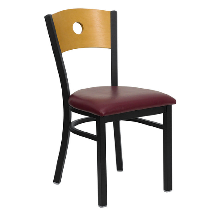 Flash Furniture XU-DG-6F2B-CIR-BURV-GG Hercules Series Restaurant Chair stands out in commercial environments with its natural finish plywood back featuring a unique circle cutout design. This chair combines robust construction with comfort, boasting a burgundy vinyl upholstered padded seat that incorporates 2-1/2" thick CA117 fire retardant foam for enhanced safety. The welded joint assembly ensures durability, while the curved support bar provides additional structural integrity. Designed for demanding commercial use, this chair features an 18-gauge steel black powder-coated frame, offering both strength and contemporary aesthetics. The inclusion of plastic floor glides ensures smooth movement and helps protect flooring surfaces. Recognized for its adaptability in diverse restaurant settings, the Flash Furniture Hercules Series chair is a reliable choice for establishments requiring seating that combines style, comfort, and safety. Though assembly is required, this chair's components are designed for straightforward setup. For busy venues, the assurance of quick shipping—typically within 24 hours for in-stock items—adds a significant convenience factor. This chair is an optimal seating solution for restaurants, cafes, and dining areas prioritizing a blend of modern design and practical functionality.