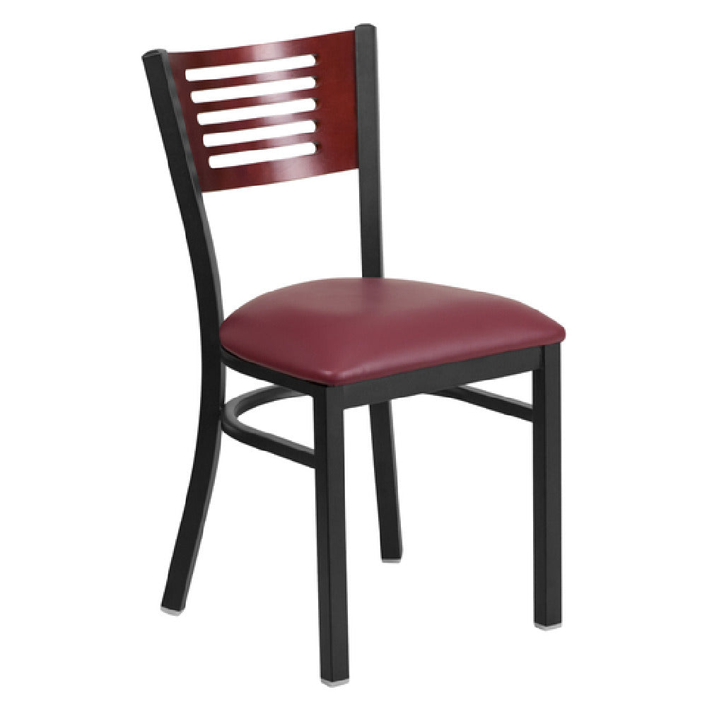 The Flash Furniture XU-DG-6G5B-MAH-BURV-GG Hercules Series Restaurant Chair is an exemplary seating solution designed for commercial environments, such as restaurants, cafes, and bars, where durability and style are paramount. This chair features a slotted mahogany finish plywood back that adds a touch of elegance to its robust construction. The seating is enhanced with a burgundy vinyl upholstered padded seat, incorporating a 2-1/2" thick CA117 fire retardant foam that ensures both safety and comfort. Built for strength, the chair boasts a welded joint assembly and an 18-gauge steel black powder-coated frame, providing a sturdy and resilient structure that withstands the demands of high-traffic areas. The inclusion of a curved support bar enhances its stability, while the plastic floor glides protect flooring surfaces from damage and facilitate smooth mobility. Designed specifically for commercial use, this chair requires assembly upon delivery, ensuring it is tailored to meet the space and design needs of various establishments. Its availability in stock allows for quick dispatch, typically shipping within 24 hours, making it an efficient choice for businesses seeking reliable and stylish seating options that combine form and function seamlessly.