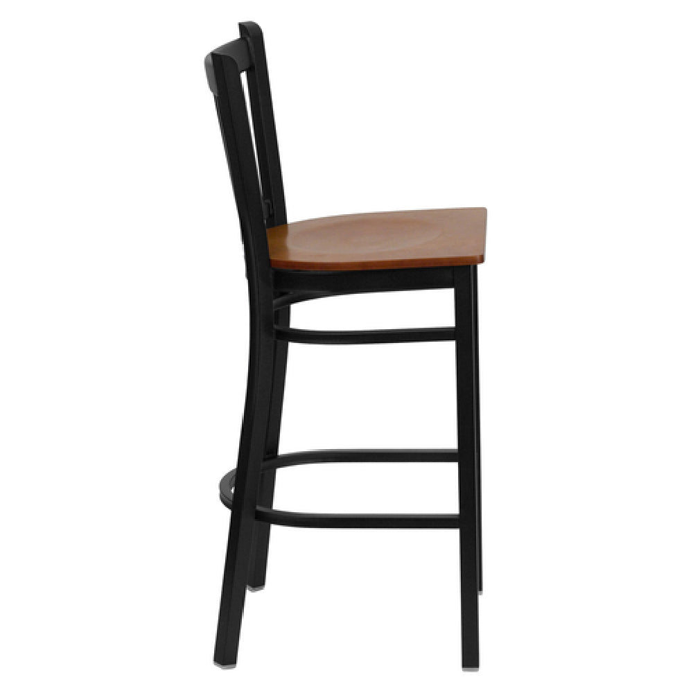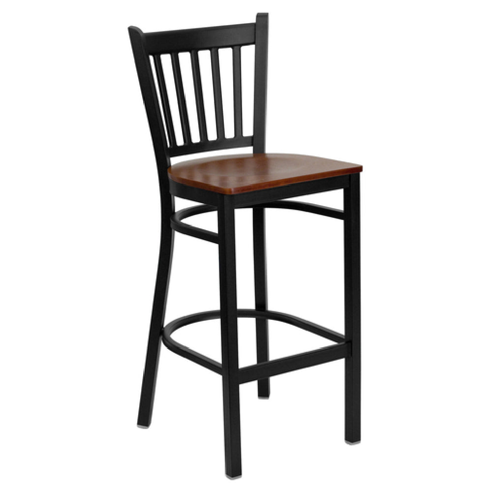 Flash Furniture XU-DG-6R6B-VRT-BAR-CHYW-GG Hercules Series Restaurant Bar Stool is a meticulously designed seating solution tailored for commercial environments. Featuring a robust metal vertical slat back, this stool is engineered for durability and stability. The seat is crafted with a 5/8-inch thick cherry finish plywood, offering a blend of comfort and aesthetic appeal. Its sturdy welded joint assembly, complemented by two curved support bars and a footrest, enhances its structural integrity, making it a reliable choice for high-traffic areas. The frame, constructed from 18-gauge steel with a black powder-coated finish, provides exceptional strength and resistance to wear and tear. Additionally, the stool is equipped with plastic floor glides, ensuring smooth movement and preventing floor damage. Designed specifically for commercial use, it requires assembly upon delivery. In-stock units are typically shipped within 24 hours, ensuring a swift procurement process for businesses. This bar stool is an ideal choice for restaurants, bars, and cafes, where both functionality and design are paramount, offering businesses a seating option that combines practicality with a touch of elegance.