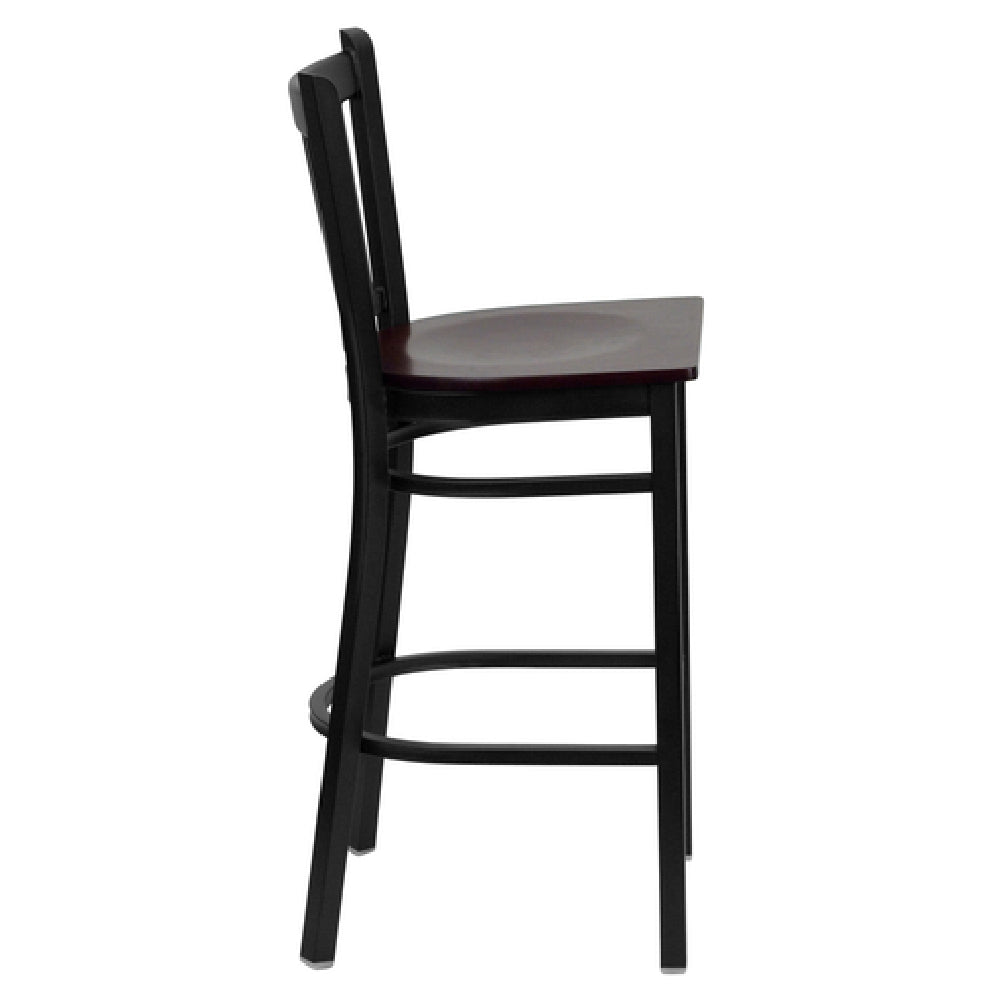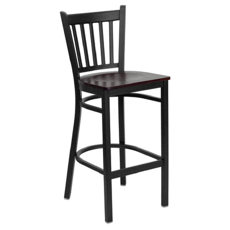 The Flash Furniture XU-DG-6R6B-VRT-BAR-MAHW-GG Hercules Series Restaurant Bar Stool is a superior seating solution designed for commercial use, highlighting its quality and durability for various industry segments such as hospitality, dining, and event spaces. This bar stool features a robust metal vertical slat back that complements a 5/8-inch thick mahogany finish plywood seat, combining aesthetic appeal with practical durability. The stool's welded joint assembly ensures structural integrity, while its (2) curved support bars provide additional stability. The inclusion of a footrest enhances user comfort, making it an excellent choice for extended seating periods. Constructed with an 18-gauge steel frame, this bar stool is black powder-coated for a sleek, modern finish that is both resilient and visually appealing. The plastic floor glides protect flooring surfaces from scratches and scuffs, ensuring that the stool is suitable for various floor types. Although assembly is required, items typically ship within 24 hours when in stock, providing a quick and efficient solution for establishments needing immediate seating solutions. The Hercules Series Restaurant Bar Stool stands as a testament to Flash Furniture's commitment to quality and functional design, offering a reliable seating option for diverse commercial environments.