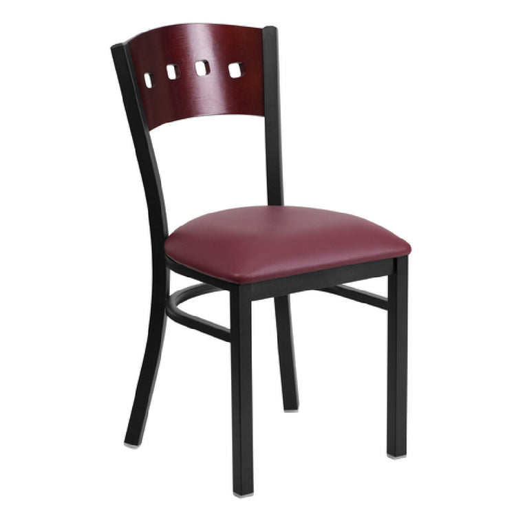 The Flash Furniture XU-DG-6Y1B-MAH-BURV-GG Hercules Series Restaurant Chair is a sophisticated seating solution characterized by its mahogany finish plywood back featuring four distinct square cutouts, adding a modern aesthetic to any dining space. This chair is designed with a burgundy vinyl upholstered padded seat, incorporating a 2-1/2" thick CA117 fire retardant foam for enhanced comfort and safety, making it a practical choice for commercial environments. The chair boasts a welded joint assembly for robust durability, complemented by a curved support bar that provides additional structural integrity. Constructed with an 18 gauge steel frame, finished in a black powder coating, it promises longevity and resilience against daily wear and tear. The inclusion of plastic floor glides ensures smooth movement and protection for flooring surfaces. Intended for commercial use, this chair meets the demands of bustling restaurants and eateries, while its stylish design also appeals to upscale dining venues seeking a blend of comfort and contemporary design. Assembly is required, and in-stock items typically ship within 24 hours, ensuring prompt delivery for businesses eager to enhance their seating arrangements. The Hercules Series chair is a versatile and durable choice for various dining settings.