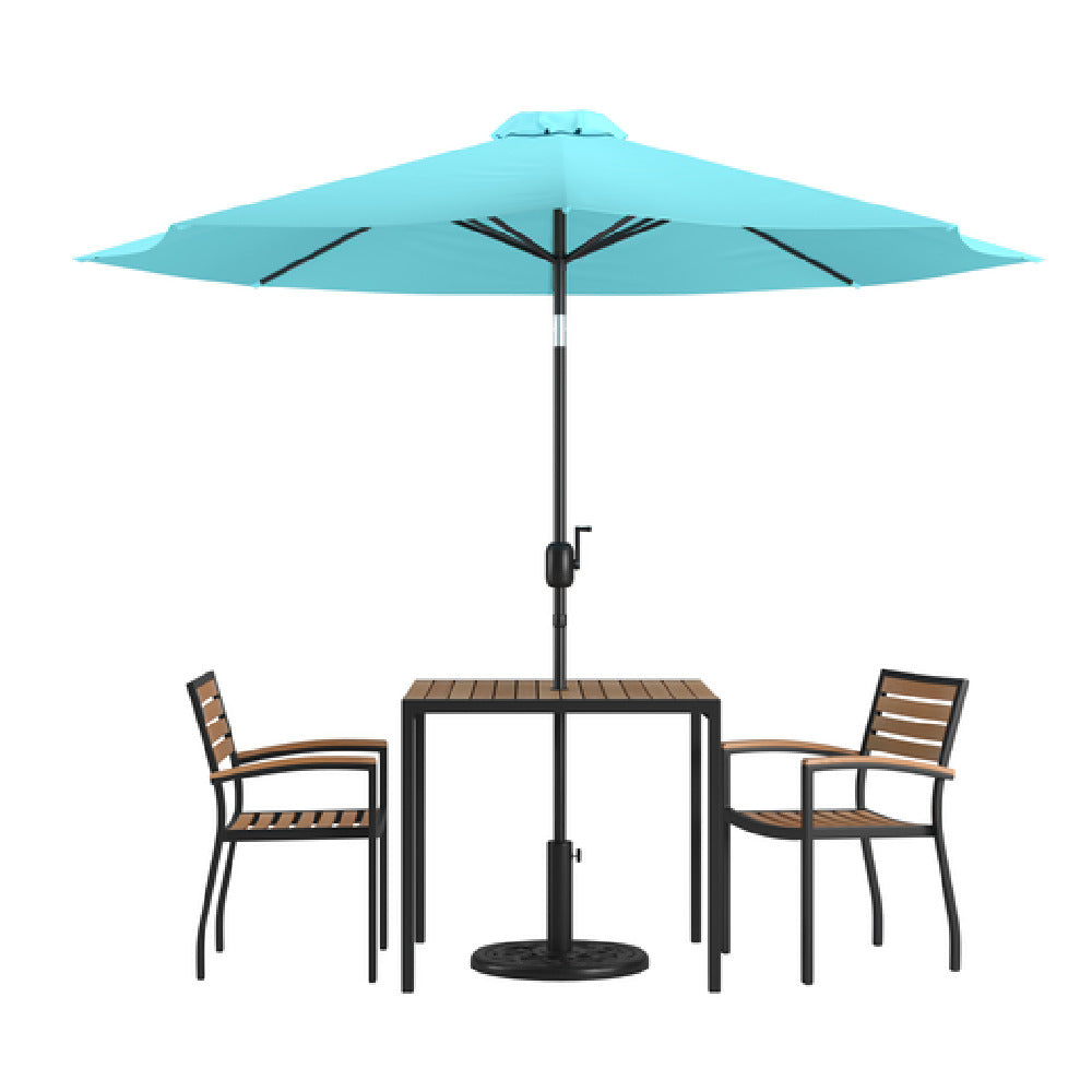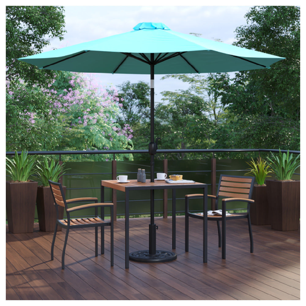 The Flash Furniture XU-DG-810060062-UB19BTL-GG Patio Dining Table Set, an excellent choice for outdoor dining settings, combines functionality and style with its detailed specifications. The set includes a 35"W square table featuring a synthetic teak slotted top, which is not only visually appealing but also practical with an umbrella hole, making it suitable for sunny conditions. The table's robust steel frame ensures durability, catering to both residential and commercial use. Accompanied by a teal umbrella and a sturdy umbrella base, this set provides shade and comfort for outdoor dining experiences. Additionally, the set includes two stacking chairs with teak-accented arms, adding to the aesthetic appeal while offering convenience for storage. This patio dining table set is ideal for different market segments, including homeowners looking to enhance their backyard ambiance, or cafe owners seeking a stylish yet functional outdoor seating solution. The combination of synthetic teak and steel construction offers a blend of modern design and traditional materials, ensuring resilience against the elements and a timeless appeal. This set is perfectly suited for those who value a cohesive and elegant outdoor dining experience, whether in a personal or professional setting.