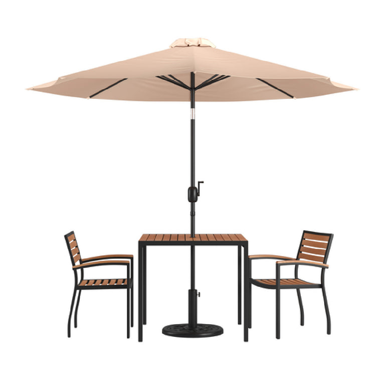 The Flash Furniture XU-DG-810060062-UB19BTN-GG Patio Dining Table Set is a comprehensive outdoor furniture solution tailored to diverse market needs. Featuring a 35"W square table with a synthetic teak slotted top, this set is designed for durability and aesthetic appeal, making it ideal for both residential and commercial outdoor spaces. The table is equipped with an umbrella hole, providing practicality for shaded dining experiences. Complementing the table, the set includes a tan umbrella and an umbrella base, ensuring stability and convenience. The steel frame construction guarantees robustness and longevity, appealing to consumers seeking reliable outdoor furniture. Additionally, the set comes with two stacking chairs, featuring teak-accented arms that enhance comfort and style. This stacking capability allows for efficient storage and space-saving, which is particularly beneficial for hospitality and catering businesses. The Flash Furniture XU-DG-810060062-UB19BTN-GG set combines functionality with elegance, offering a versatile choice for patios, gardens, and outdoor dining areas. Its thoughtful design and quality materials position it as a valuable asset for those in the hospitality industry, as well as homeowners looking to enhance their outdoor living spaces with a touch of sophistication.