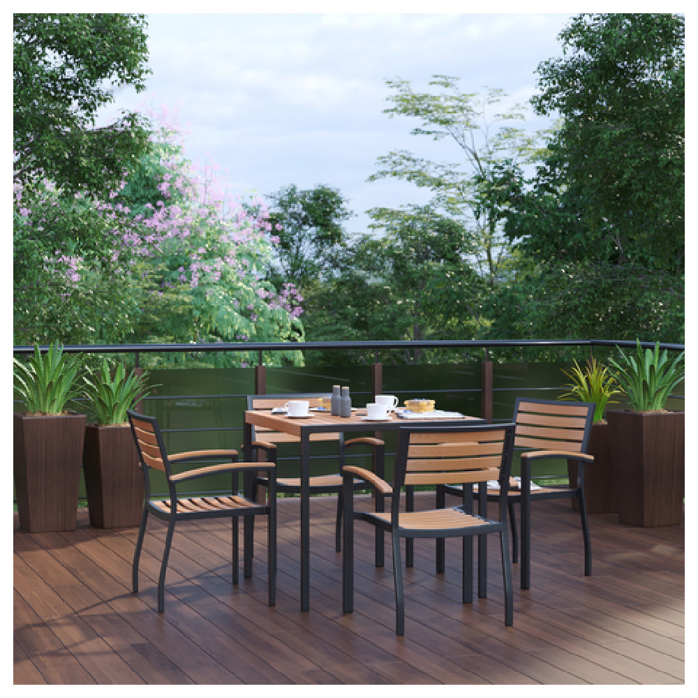 The Flash Furniture XU-DG-810060064-GG Patio Dining Table Set is a meticulously designed outdoor ensemble catering to diverse market segments within the hospitality and residential sectors. At its core is a 35"W square table featuring a synthetic teak slotted top, which not only enhances the aesthetic appeal but also ensures durability and easy maintenance. The table is equipped with an umbrella hole, providing the flexibility to add shade for comfort in sunny settings. Supported by a robust steel frame, this table promises stability and longevity, making it a valuable addition to any patio or outdoor dining space. Complementing the table are four stacking chairs, designed for efficient storage and featuring teak accented arms that match the table's top, creating a cohesive and elegant look. This set is ideal for both commercial venues such as cafes and restaurants seeking durable and stylish outdoor furniture, as well as homeowners desiring a sophisticated yet functional patio dining solution. The combination of materials and design elements positions the Flash Furniture XU-DG-810060064-GG Patio Dining Table Set as a versatile and practical choice for enhancing any outdoor dining experience.