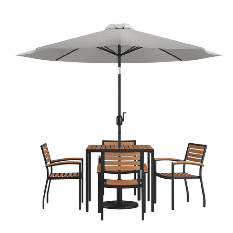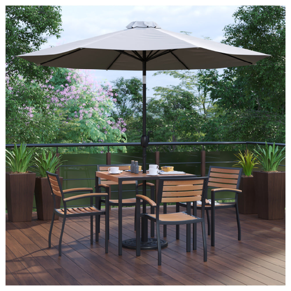 The Flash Furniture XU-DG-810060064-UB19BGY-GG Patio Dining Table Set is a meticulously designed outdoor furniture ensemble that includes a 35-inch wide square table, which features a synthetic teak slotted top for a stylish and durable surface. The table also incorporates an umbrella hole, offering convenience for shaded dining experiences. A sturdy steel frame underpins the table, ensuring long-lasting stability and support. Complementing the table is a gray umbrella and a matching umbrella base, constructed to provide reliable protection from the sun. This set also features four stacking chairs, each enhanced with teak-accented arms, combining aesthetic appeal with comfort. The stacking capability of the chairs not only provides ease of storage but also offers flexibility for various outdoor spaces. This patio dining set is an excellent choice for those seeking a blend of functionality and elegance in outdoor furniture. Its thoughtful design and robust construction make it suitable for residential patios, commercial outdoor dining areas, and hospitality venues, catering to a diverse range of industry needs. The combination of synthetic materials and steel promises resilience against weather elements while maintaining an inviting and sophisticated look, making it a versatile addition to any outdoor setting.
