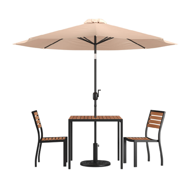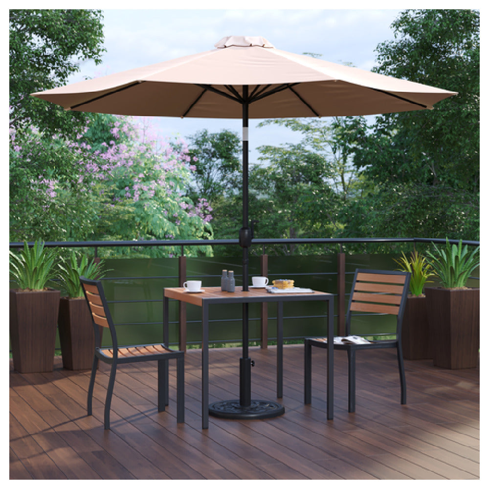 The Flash Furniture XU-DG-810060362-UB19BTN-GG Patio Dining Table Set is a meticulously crafted outdoor furniture ensemble, tailored for both residential and commercial use. This set includes a 35"W square table featuring a synthetic teak slotted top, which not only enhances durability but also adds a touch of elegance to any patio setting. The table is designed with an umbrella hole, accommodating the included tan umbrella and its base, providing shade and comfort during sunny days. The robust steel frame ensures stability and long-lasting performance, making it ideal for various weather conditions. Accompanied by two stacking faux teak chairs, this set offers space-saving convenience and easy storage, perfect for dynamic outdoor environments. Whether for a cozy family gathering or a bustling café patio, this dining table set delivers both style and functionality. Its combination of durability, aesthetic appeal, and practical design caters to a wide range of market segments, from homeowners seeking stylish outdoor solutions to businesses in the hospitality industry looking for reliable and attractive dining setups. The Flash Furniture patio dining table set exemplifies quality and adaptability, meeting diverse needs while enhancing outdoor dining experiences.