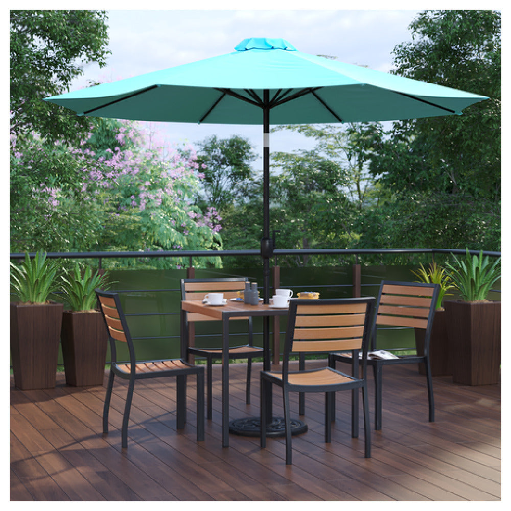 The Flash Furniture XU-DG-810060364-UB19BTL-GG Patio Dining Table Set is a comprehensive outdoor dining solution that combines practicality with style, catering to both residential and commercial applications. Featuring a 35-inch wide square table, this set is distinguished by its synthetic teak slotted top that offers both durability and a sleek aesthetic appeal. The table is equipped with an umbrella hole, accommodating the included teal umbrella, which provides shade and comfort, making it ideal for sunny settings. Secured by a sturdy steel frame, the table ensures long-lasting stability and support. Complementing the table are four stacking faux teak chairs, which not only offer convenience in storage but also enhance the overall visual harmony of the set. The inclusion of an umbrella base ensures the umbrella remains securely in place, providing consistent shade throughout usage. This patio dining table set is designed to meet the needs of a variety of market segments, from homeowners looking to enhance their backyard aesthetics to businesses aiming to furnish outdoor dining areas with functional and visually appealing furniture. Its design marries utility with elegance, making it a versatile choice for those prioritizing both function and style in their outdoor furnishings.