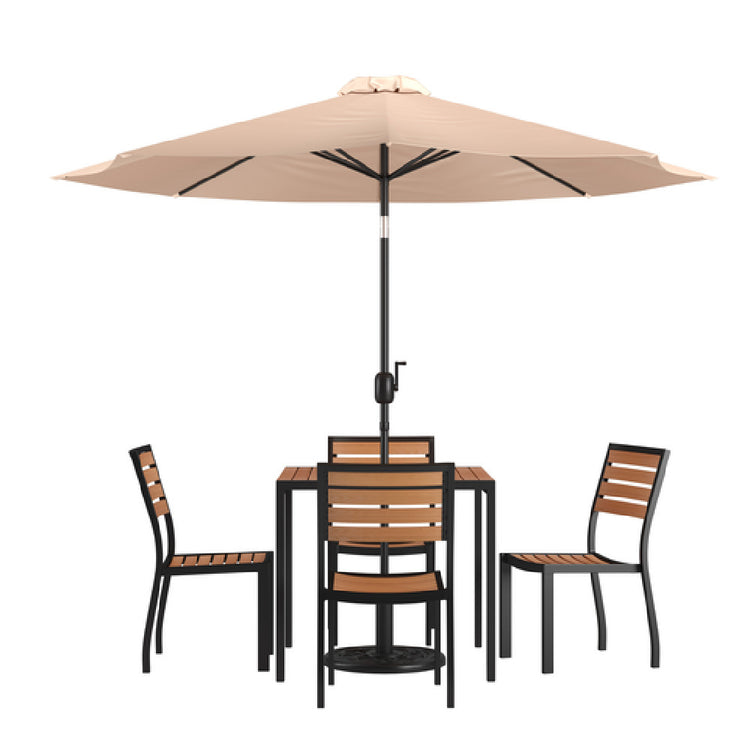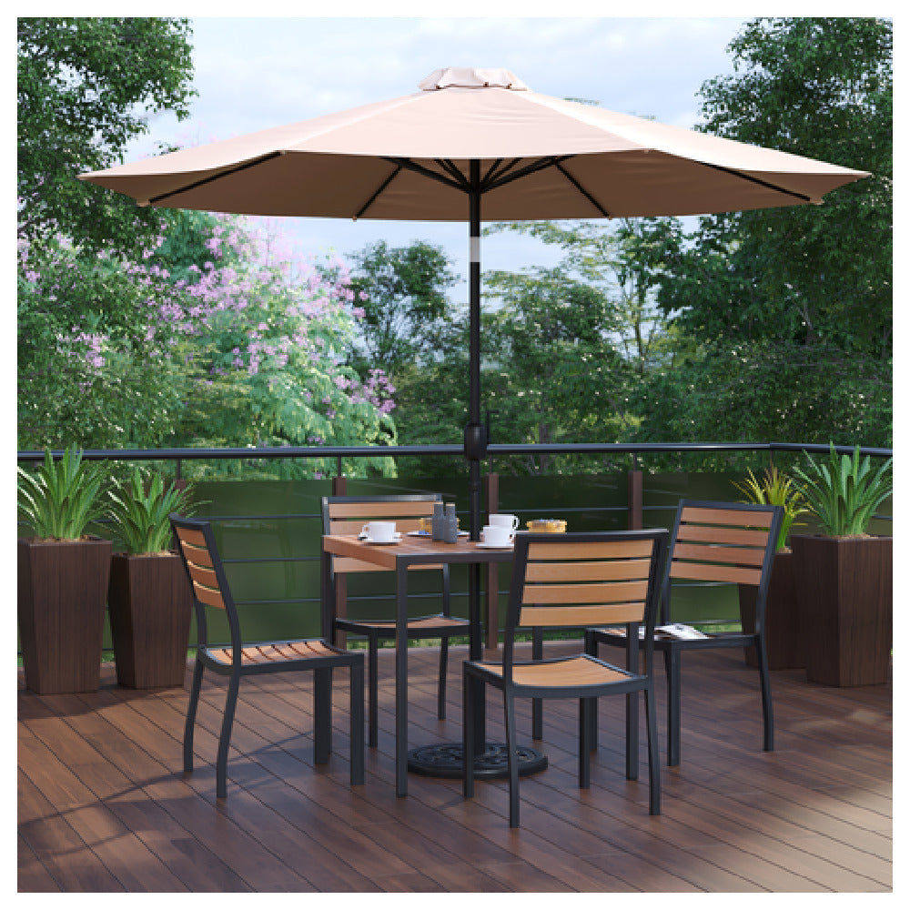 The Flash Furniture XU-DG-810060364-UB19BTN-GG Patio Dining Table Set is a meticulously designed outdoor furniture ensemble that caters to diverse market segments in the patio dining industry. This set includes a 35-inch wide square table, featuring a synthetic teak slotted top for a stylish and weather-resistant surface. The table is equipped with an umbrella hole, allowing for versatile use and convenience in sunny weather. The steel frame ensures durability and stability, making it ideal for long-term outdoor use. Complementing the table is a tan umbrella and a sturdy umbrella base, providing shade and comfort during outdoor meals. Additionally, the set includes four stacking faux teak chairs, designed for easy storage and transport, while maintaining the aesthetic appeal of natural teak. This combination of materials and features positions the Flash Furniture Patio Dining Table Set as an attractive choice for homeowners seeking a blend of durability, functionality, and modern design in their outdoor spaces. Whether for residential patios or commercial outdoor dining areas, this set offers a complete package for those looking to enhance their outdoor dining experience with enduring style and practicality.