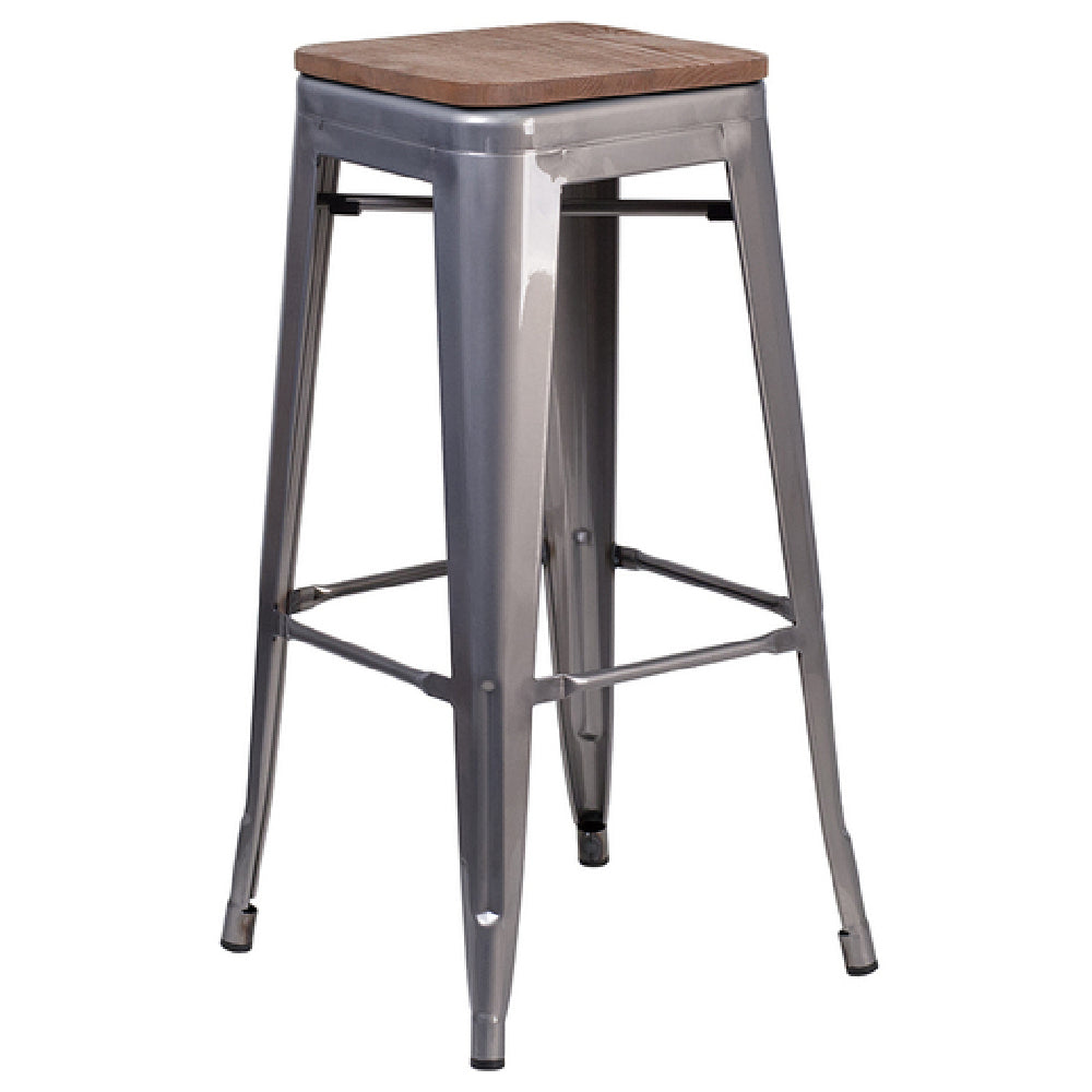 The Flash Furniture XU-DG-TP0004-30-WD-GG bar stool stands out with its 30-1/4-inch seat height and impressive 500 lb. weight capacity, catering to both commercial and residential settings. Its backless design, paired with a textured wood seat, provides a modern aesthetic while ensuring durability. This stool features a cross brace under the seat for enhanced stability, making it a reliable choice for high-traffic environments. Constructed from galvanized steel with a powder coat finish, it offers resilience against wear and tear. The addition of a footrest enhances comfort, while plastic floor glides protect floors from scratches. Lightweight and stackable up to 15 stools high, this product is easy to store and ideal for spaces with varying seating needs. The silver color with a clear coat finish adds a touch of elegance to any setting. Assembly is required, and in-stock items typically ship within 24 hours, ensuring quick delivery for time-sensitive projects. This bar stool is designed to meet the needs of a diverse market, from trendy urban cafes to rustic home kitchens, offering a blend of style, strength, and functionality.