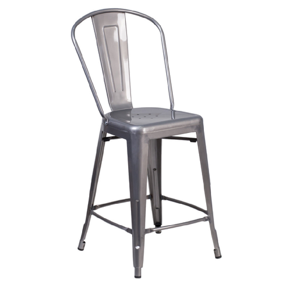 The Flash Furniture XU-DG-TP001B-24-GG Bar Stool stands out with its 24-1/2" seat height and impressive 500 lb. weight capacity, making it a practical and durable choice for various settings, from bustling commercial venues to cozy residential spaces. The stool features a curved back with a vertical slat, offering both ergonomic support and a contemporary aesthetic appeal. Made from galvanized steel with a powder coat finish, this bar stool boasts enhanced durability and resilience against wear and tear. The inclusion of a drain hole in the seat facilitates easy maintenance, ensuring the bar stool remains in pristine condition over time. A cross brace under the seat provides additional stability, while the integrated footrest enhances user comfort. Plastic floor glides protect flooring surfaces and promote effortless mobility. Designed to be lightweight, this bar stool can be easily repositioned to suit the dynamic needs of any environment. Available in a striking silver with a clear coat finish, it requires assembly upon delivery, with in-stock items typically shipping within 24 hours. This versatile bar stool is crafted for both indoor commercial and residential use, offering a blend of style, strength, and functionality.