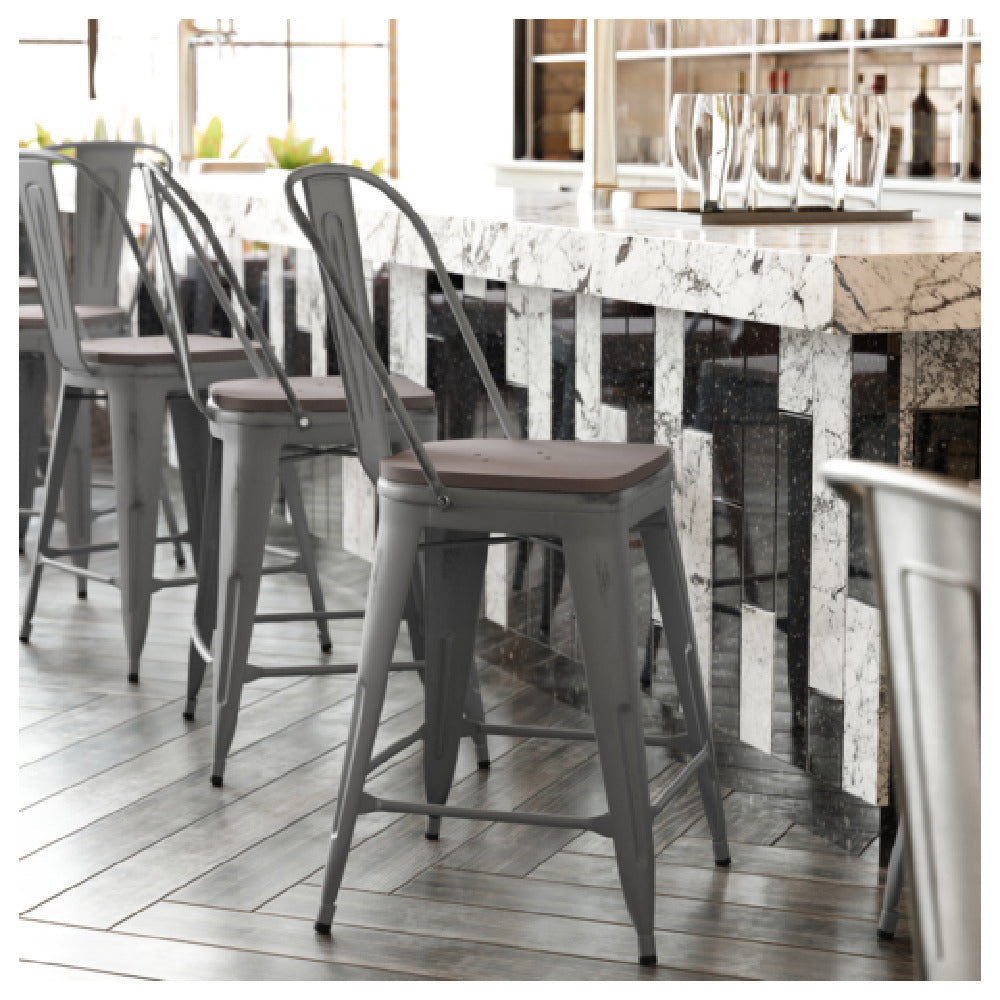 The Flash Furniture XU-DG-TP001B-24-PL1G-GG Lincoln Bar Stool is a versatile seating solution with a 24-inch seat height and a formidable weight capacity of 500 lbs, tailored for varied commercial settings. Featuring a curved back with a vertical slat design, this bar stool merges comfort with style, making it a standout piece in hospitality environments such as cafes, bars, and restaurants. The seat is crafted from poly resin, ensuring durability and ease of maintenance, while the underseat cross bracing adds to its structural stability. The clear coated powder coated steel frame not only enhances its aesthetic appeal but also offers long-lasting protection against wear. A convenient footrest is included, providing additional comfort for extended seating periods. Plastic floor glides are incorporated to protect flooring surfaces, making it practical for high-traffic indoor spaces. Note that this stool is designed specifically for indoor use and requires assembly upon delivery. Its gray finish complements a wide range of interior décor styles, allowing for seamless integration into existing setups. This product is engineered for those who prioritize strength and design in their furniture choices, making it a reliable option across diverse market segments within the furniture industry.