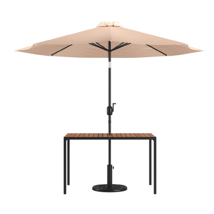 The Flash Furniture XU-DG-UH3048-UB19BTN-GG Patio Dining Table Set includes a 48-inch wide by 30-inch deep rectangular table, making it an ideal choice for outdoor dining spaces that require both functionality and style. The synthetic teak slotted top provides a sleek and modern appearance while ensuring durability and resistance to weather elements, making it suitable for various climates. This table set also features a strategically placed umbrella hole, allowing easy integration of an umbrella to provide shade and comfort during sunny days. The sturdy steel frame offers robust support and stability, ensuring long-lasting use. Additionally, the set comes with a tan umbrella and a matching umbrella base, adding value by providing a complete outdoor dining solution. This product is particularly suited for residential patios, commercial outdoor dining areas, and hospitality settings, where both aesthetics and practicality are essential. Its versatile design and comprehensive features make the Flash Furniture XU-DG-UH3048-UB19BTN-GG Patio Dining Table Set a valuable addition to any outdoor space, combining elegance and utility in one cohesive package.