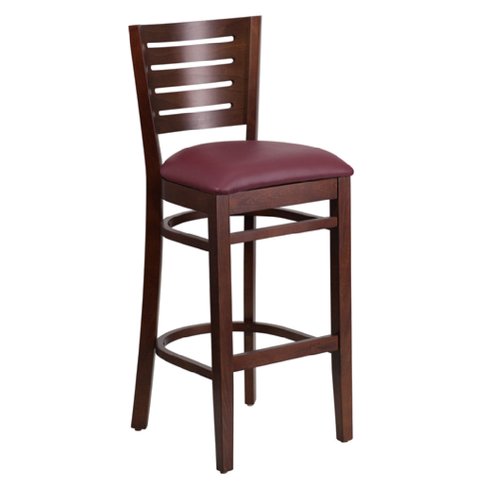 The Flash Furniture XU-DG-W0108BBAR-WAL-BURV-GG Darby Series Bar Stool is a finely crafted seating solution designed for both style and durability, ideal for various commercial settings. Featuring a wood slat back and a European beechwood frame with a walnut finish, this bar stool combines elegance with sturdy construction. The seat is upholstered in burgundy vinyl, padded with a 2-1/2" thick CA117 fire retardant foam, ensuring both comfort and safety. Its mortise and tenon style construction, reinforced with metal wood screws, enhances its structural integrity. Additionally, the design includes two curved support bars and a footrest, offering ergonomic support for extended use. The stool is equipped with plastic floor glides to protect flooring surfaces and facilitate easy repositioning. While assembly is required, the product ships swiftly, usually within 24 hours. This Darby Series Bar Stool meets the demands of the hospitality industry, providing reliable and stylish seating solutions for bars, restaurants, and other commercial environments.