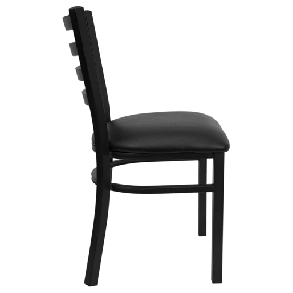 The Flash Furniture XU-DG694BLAD-BLKV-GG Hercules Series Restaurant Chair is a meticulously designed piece tailored for the demanding environment of commercial use. This chair features a metal ladder back and a black vinyl upholstered padded seat, offering both durability and comfort. The seat is padded with a 2-1/2" thick CA117 fire retardant foam, ensuring safety and comfort in bustling settings. Constructed with an 18 gauge steel frame, it is finished with a black powder coating, providing a sleek and resistant surface against wear and tear. The chair's welded joint assembly enhances its structural integrity, and the inclusion of a curved support bar contributes to its robust stability. To protect flooring and facilitate easy movement, it is equipped with plastic floor glides. Available for prompt dispatch, in-stock items are typically shipped within 24 hours, making it an efficient choice for restaurant proprietors looking to furnish their spaces swiftly. Assembly is required, allowing for straightforward integration into various dining arrangements. Ideal for restaurants, cafes, and bistros, this chair combines aesthetic appeal with practical design, catering to the dynamic needs of the hospitality industry by offering a blend of style, safety, and resilience.