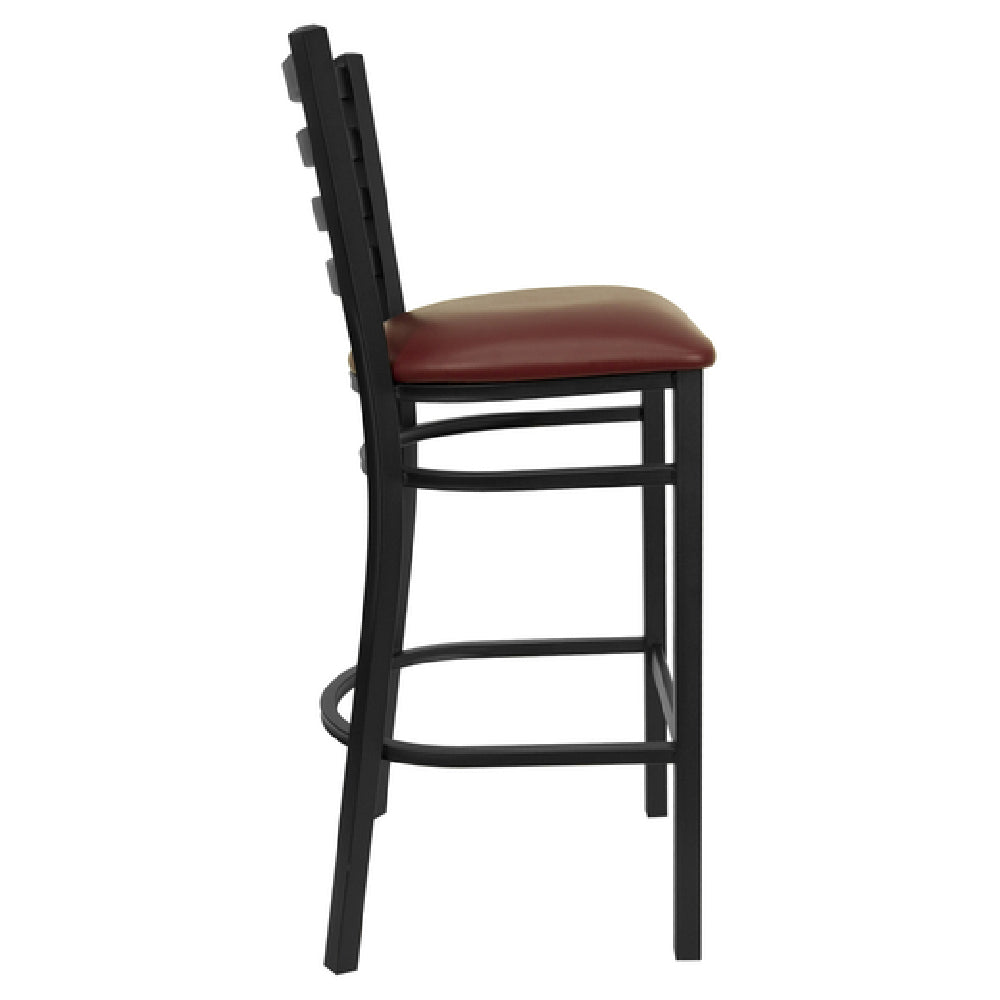 The Flash Furniture XU-DG697BLAD-BAR-BURV-GG Hercules Series Restaurant Bar Stool is engineered for durability and comfort, making it a staple for commercial environments. Featuring a metal ladder back design, this bar stool is built with an 18-gauge steel black powder-coated frame, ensuring robust structural integrity for high-traffic settings. The seat is upholstered in burgundy vinyl and houses a 2-1/2" thick CA117 fire retardant foam, providing both safety and comfort for users. Welded joint assembly enhances the stool's stability, while two curved support bars and a footrest contribute to the user's ease and ergonomic posture. For floor protection, the stool is equipped with plastic floor glides, minimizing potential surface damage. Designed explicitly for commercial use, this bar stool requires assembly upon delivery, with in-stock items typically shipping within 24 hours. The Flash Furniture Hercules Series Bar Stool is a versatile addition to any restaurant, bar, or hospitality space, combining aesthetic appeal with functional design, catering to diverse industry needs.