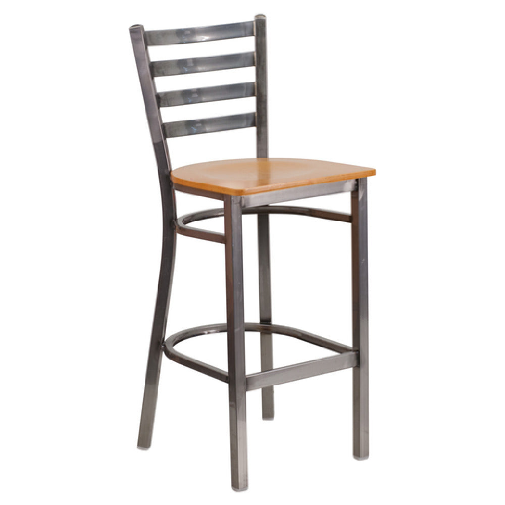 The Flash Furniture XU-DG697BLAD-CLR-BAR-NATW-GG Hercules Series Restaurant Bar Stool is a meticulously designed seating solution that combines durability and style, making it a preferred choice for various commercial establishments. Featuring a robust metal ladder back, this bar stool is constructed with welded joint assembly, ensuring long-lasting use in high-traffic areas. The seat is crafted from 5/8-inch thick natural finish plywood, providing a comfortable and aesthetically pleasing seating experience. The design integrates two curved support bars along with a footrest, enhancing stability and user comfort. Built with an 18-gauge steel frame that is clear coated, this bar stool offers a sleek and modern look while maintaining structural integrity. Additionally, plastic floor glides are included to protect flooring surfaces and allow for smooth movement. This product is designed for commercial use, making it suitable for restaurants, bars, and cafes that demand both functionality and a sophisticated appearance. Assembly is required, and the product is available for quick shipment, typically within 24 hours when in stock. The Flash Furniture Hercules Series Bar Stool is an outstanding choice for businesses seeking reliable and stylish seating options.