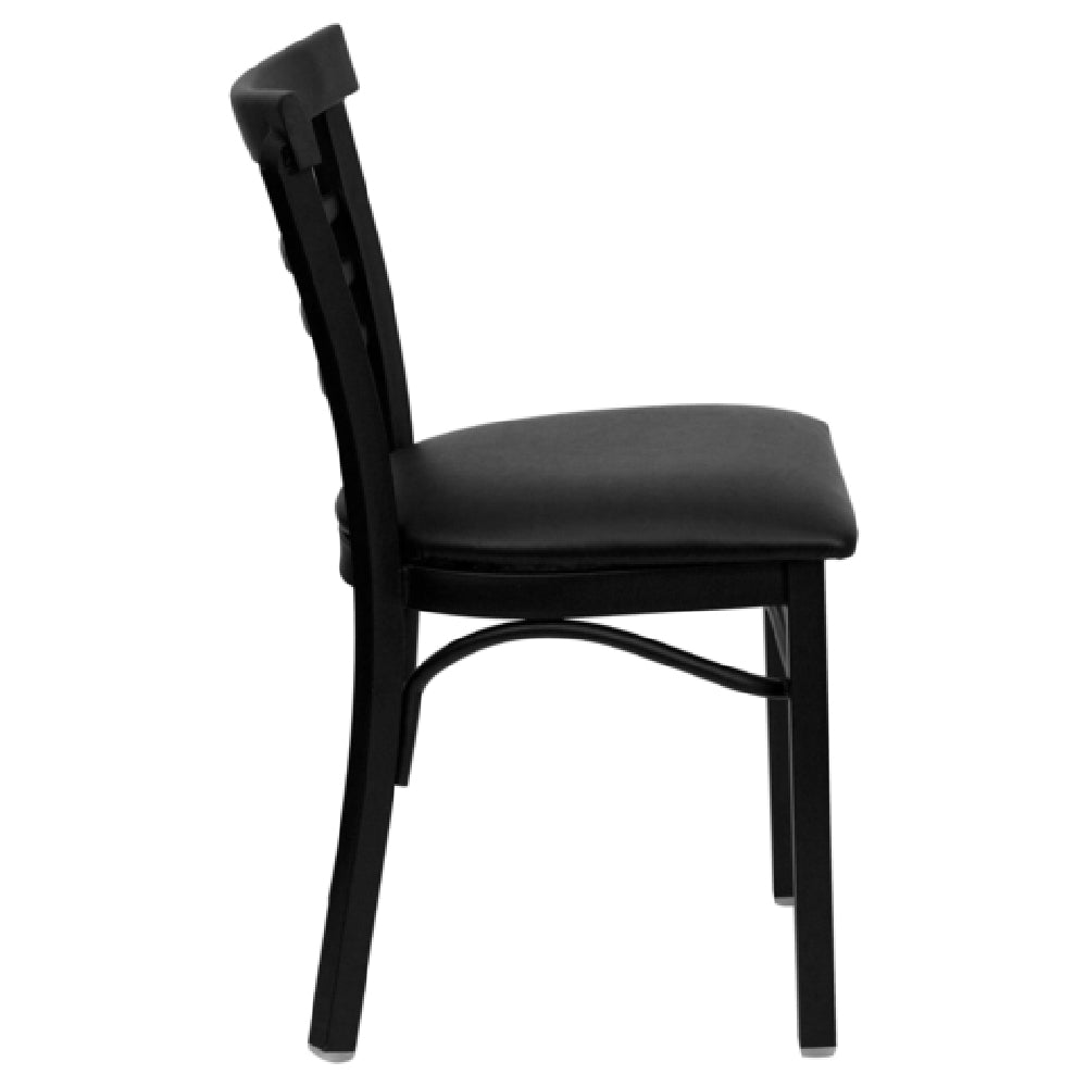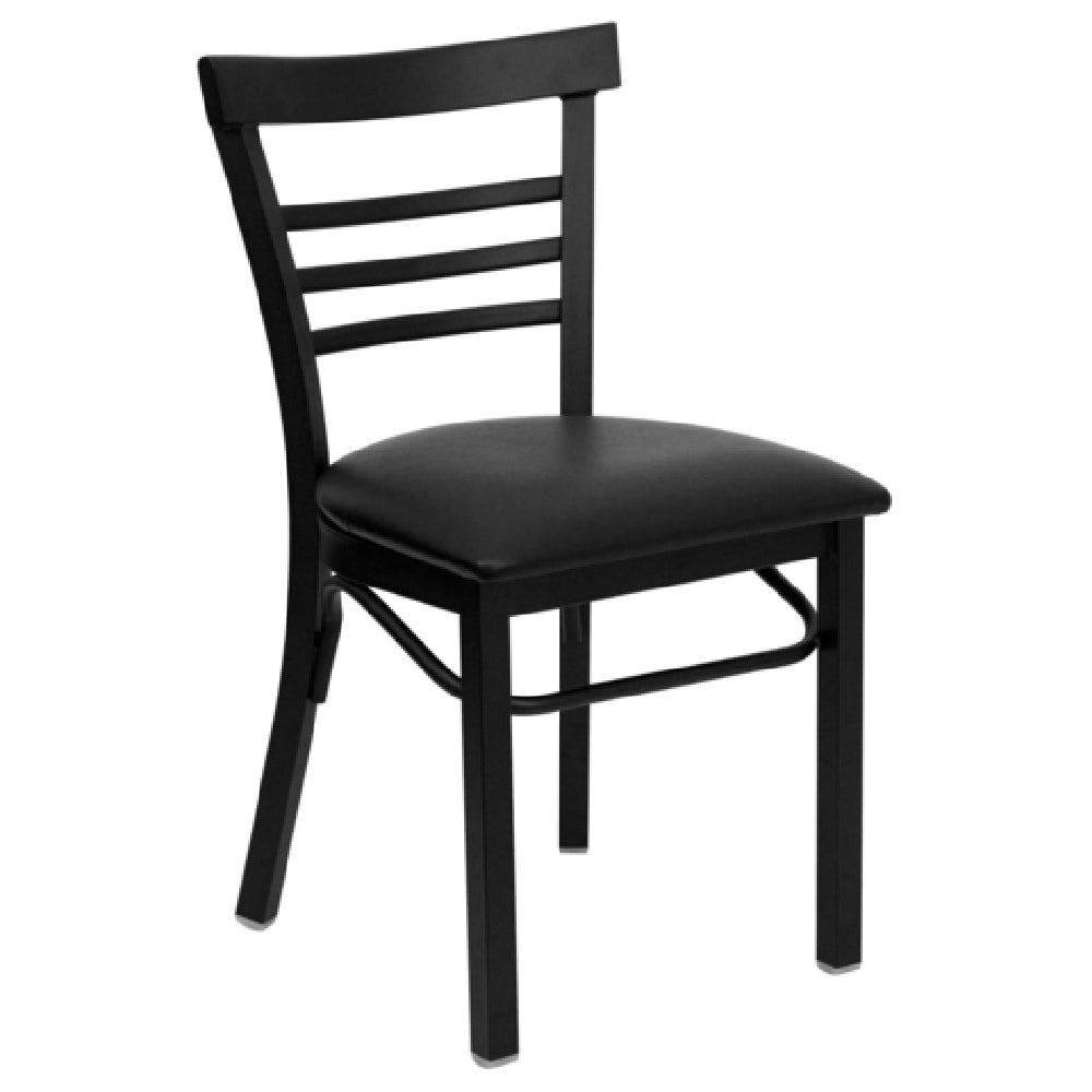 The Flash Furniture XU-DG6Q6B1LAD-BLKV-GG Hercules Series Restaurant Chair Ladder Back is a quintessential choice for dining establishments seeking durability and comfort. This chair features a robust 18-gauge steel frame with a black powder coat finish, ensuring long-lasting use in high-traffic environments. The ladder back design not only adds a classic aesthetic appeal but also provides ergonomic support for patrons. The chair's seat is upholstered with a black vinyl covering, and it is padded with a 2-1/2" thick foam, offering excellent comfort. Additionally, the foam is CA117 fire retardant, underscoring a commitment to safety standards. For superior stability, the chair includes a welded joint assembly and a curved support bar. Practicality is enhanced by plastic floor glides, which protect flooring and facilitate easy movement. This chair requires assembly but is otherwise ready to ship within 24 hours when in stock. The Flash Furniture Hercules Series chair is ideal for restaurants, cafes, and dining halls looking for a combination of style, resilience, and comfort.