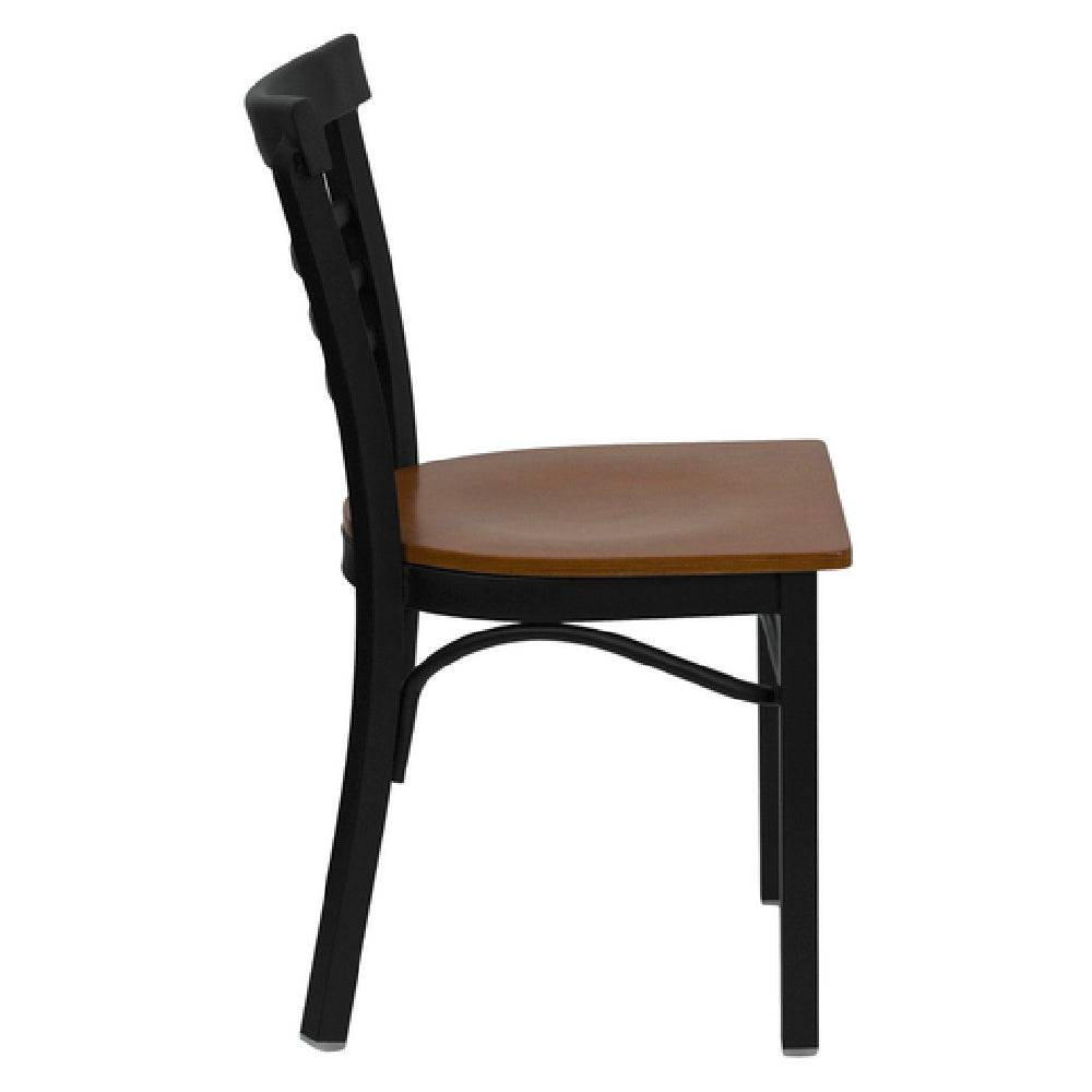 The Flash Furniture XU-DG6Q6B1LAD-CHYW-GG Hercules Series Restaurant Side Chair Ladder Back is a meticulously designed seating solution perfect for restaurant settings that require durability and style. It features a 5/8" thick plywood seat, providing robust support and comfort for patrons. The chair's frame is constructed from 18-gauge steel, known for its strength and reliability, and it boasts a black powder-coated finish that adds a sleek, modern touch while also ensuring resistance to wear and tear over time. The welded joint assembly enhances the chair's structural integrity, making it a long-lasting choice for high-traffic areas. A curved support bar is integrated into the design to provide additional reinforcement, while plastic floor glides prevent damage to flooring and allow for easy movement. The cherry wood finish adds a warm, inviting aesthetic, complementing various interior designs. This product requires assembly and is conveniently available for quick shipping, with in-stock items typically dispatched within 24 hours. The Flash Furniture Hercules Series chair is ideal for a range of market segments, including restaurants, cafes, and bistros seeking functionality combined with an elegant design. Its technical specifications underscore its suitability for commercial environments where durability and style are paramount.