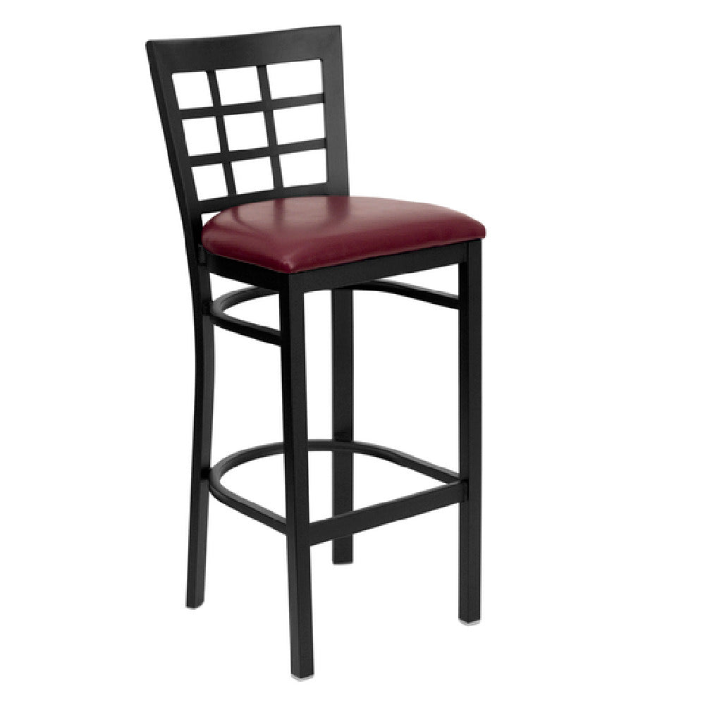 The Flash Furniture XU-DG6R7BWIN-BAR-BURV-GG Hercules Series Restaurant Bar Stool is a versatile and durable seating solution designed for commercial settings. Featuring a metal window pane back, this bar stool combines style and strength, making it an ideal choice for restaurant and bar environments. The seat is upholstered in burgundy vinyl and is padded with a 2-1/2 inch thick CA117 fire retardant foam, ensuring both comfort and safety. This stool is constructed with an 18 gauge steel black powder coated frame, providing a sturdy and long-lasting structure. It includes welded joint assembly and two curved support bars which enhance its durability, while a footrest adds to user comfort. The plastic floor glides protect flooring surfaces, making it practical for high-traffic areas. Designed with commercial use in mind, this bar stool requires assembly and is usually ready for shipment within 24 hours when in stock. Its robust construction and elegant design make it a valuable addition to any hospitality setting, able to withstand the demands of daily use while offering a sophisticated seating option for guests.