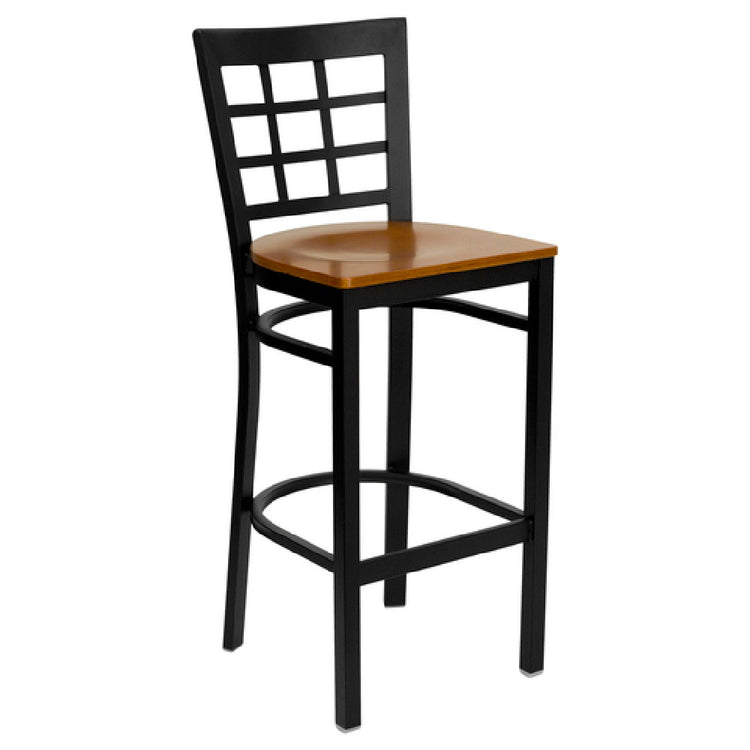 The Flash Furniture XU-DG6R7BWIN-BAR-CHYW-GG Hercules Series Restaurant Bar Stool is an ideal seating solution for various commercial environments. This bar stool features a distinctive metal window pane back, providing a stylish yet sturdy support for patrons. The seat is crafted from 5/8-inch thick cherry finish plywood, offering both durability and an attractive aesthetic. The welded joint assembly ensures structural integrity, while the two curved support bars and a footrest enhance stability and comfort. Constructed with an 18-gauge steel frame, this bar stool is black powder-coated for added resilience against the wear and tear of frequent use. It is equipped with plastic floor glides, facilitating smooth movement without scratching floors, which is particularly beneficial for high-traffic venues. Designed for commercial use, the Flash Furniture Hercules Series Bar Stool requires assembly, allowing for efficient shipping and handling. In-stock items are typically shipped within 24 hours, ensuring quick availability for businesses needing to furnish their spaces promptly. This bar stool is a versatile choice for restaurants, bars, or cafes looking to combine functionality with a modern design. Its robust construction and thoughtful design elements make it a reliable fixture in any hospitality setting.
