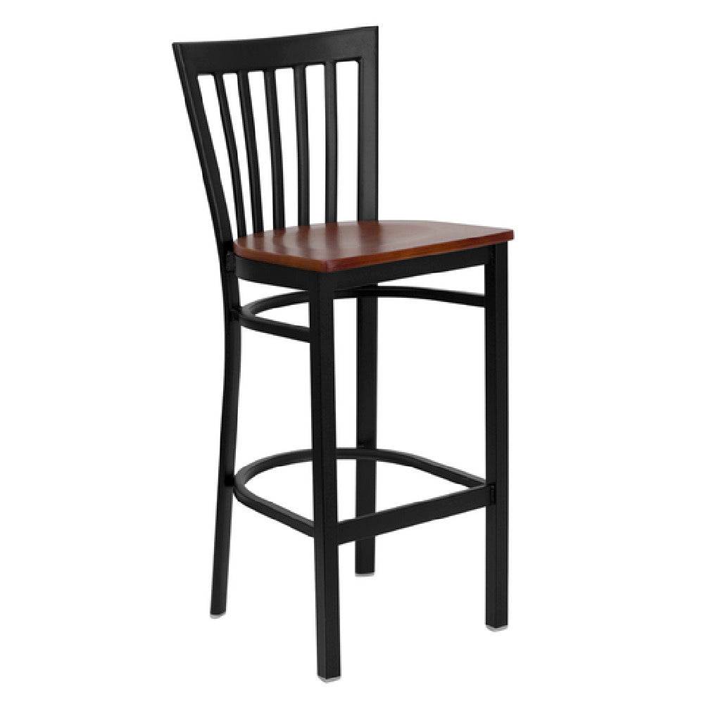 The Flash Furniture XU-DG6R8BSCH-BAR-CHYW-GG Hercules Series Restaurant Bar Stool is a meticulously engineered seating solution ideal for commercial settings. Featuring a robust metal schoolhouse back, it combines durability with classic design, ensuring it fits seamlessly into various decor styles. The seat is crafted from 5/8-inch thick cherry finish plywood, offering both aesthetic appeal and comfort. This bar stool boasts a welded joint assembly and is supported by two curved support bars, enhancing its structural integrity. The inclusion of a footrest adds to user comfort, while the 18-gauge steel black powder-coated frame provides a sturdy foundation capable of withstanding rigorous commercial use. Plastic floor glides are integrated to protect flooring surfaces and facilitate easy movement. The product requires assembly upon delivery but is readily available, with in-stock items typically shipping within 24 hours. The Flash Furniture Hercules Series is designed for those seeking reliable and stylish seating options in restaurants, bars, and other hospitality venues, where both form and function are paramount. Its thoughtful construction and quality materials make it a valuable addition to any establishment looking to provide patrons with comfortable and enduring seating solutions.