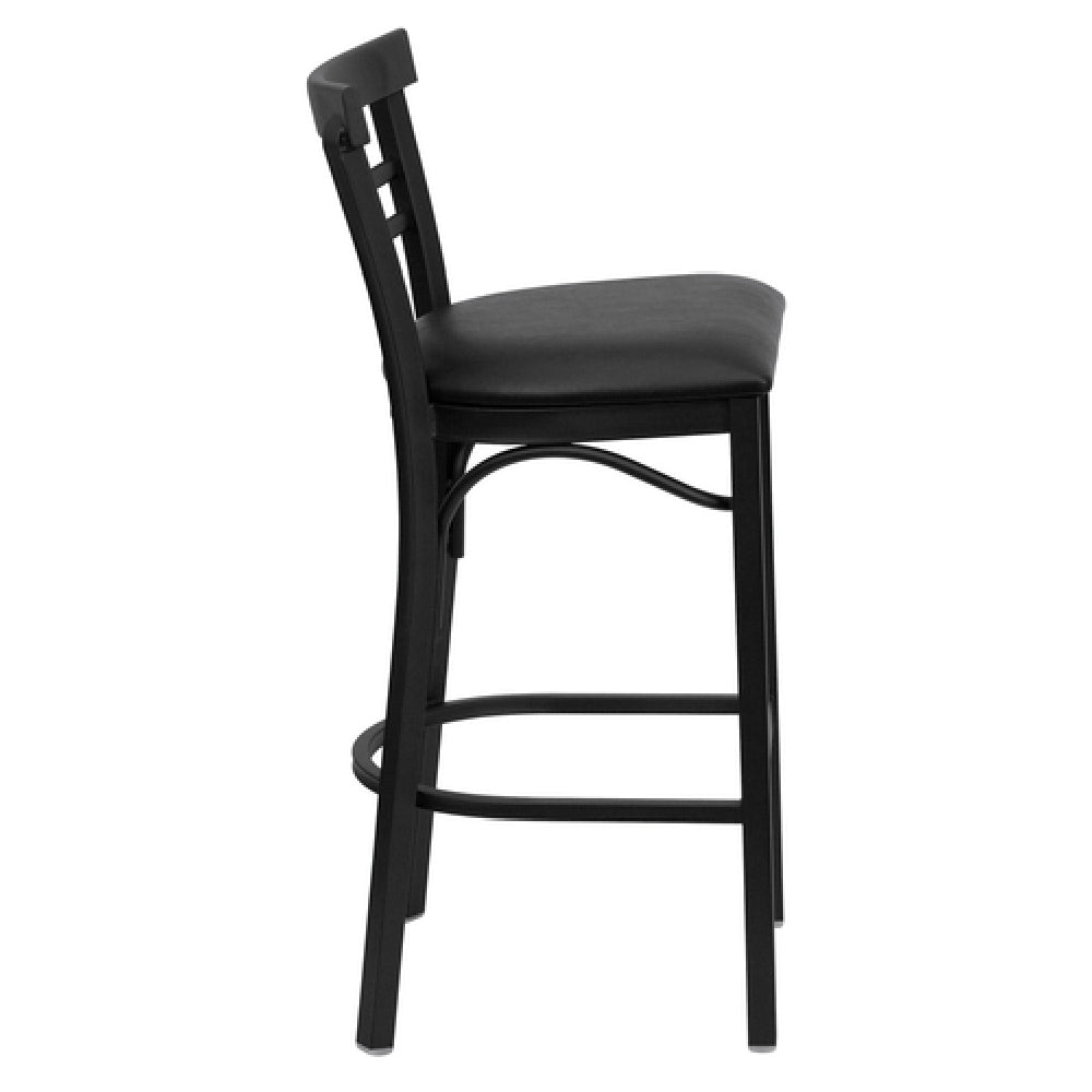 The Flash Furniture XU-DG6R9BLAD-BAR-BLKV-GG Hercules Series Restaurant Bar Stool is expertly crafted to meet the demands of commercial environments while providing comfort and durability. This stool features a sophisticated metal ladder back design, ensuring both aesthetic appeal and robust support. The seat is upholstered in black vinyl and padded with a 2-1/2" thick CA117 fire retardant foam for enhanced safety and comfort. The welded joint assembly contributes to its structural integrity, reinforced by two curved support bars and a footrest for added stability. Constructed with an 18 gauge steel black powder coated frame, this stool is both resilient and sleek, designed to withstand the rigors of high-traffic areas. Plastic floor glides ensure smooth movement, protecting flooring surfaces from scratches and damage. The Flash Furniture XU-DG6R9BLAD-BAR-BLKV-GG is specifically designed for commercial use, making it an ideal seating solution for restaurants, bars, and cafes. Assembly is required, allowing for straightforward setup in any setting. In-stock items are usually shipped within 24 hours, providing a quick and efficient solution for businesses in need of durable and stylish seating options. This bar stool is a reliable choice for any commercial dining environment, combining functionality with a modern design.
