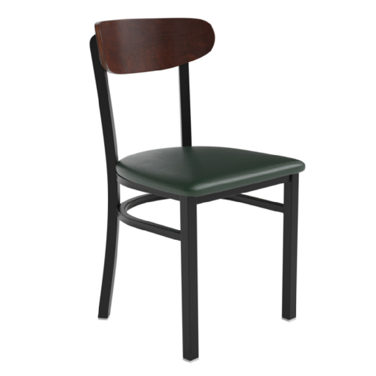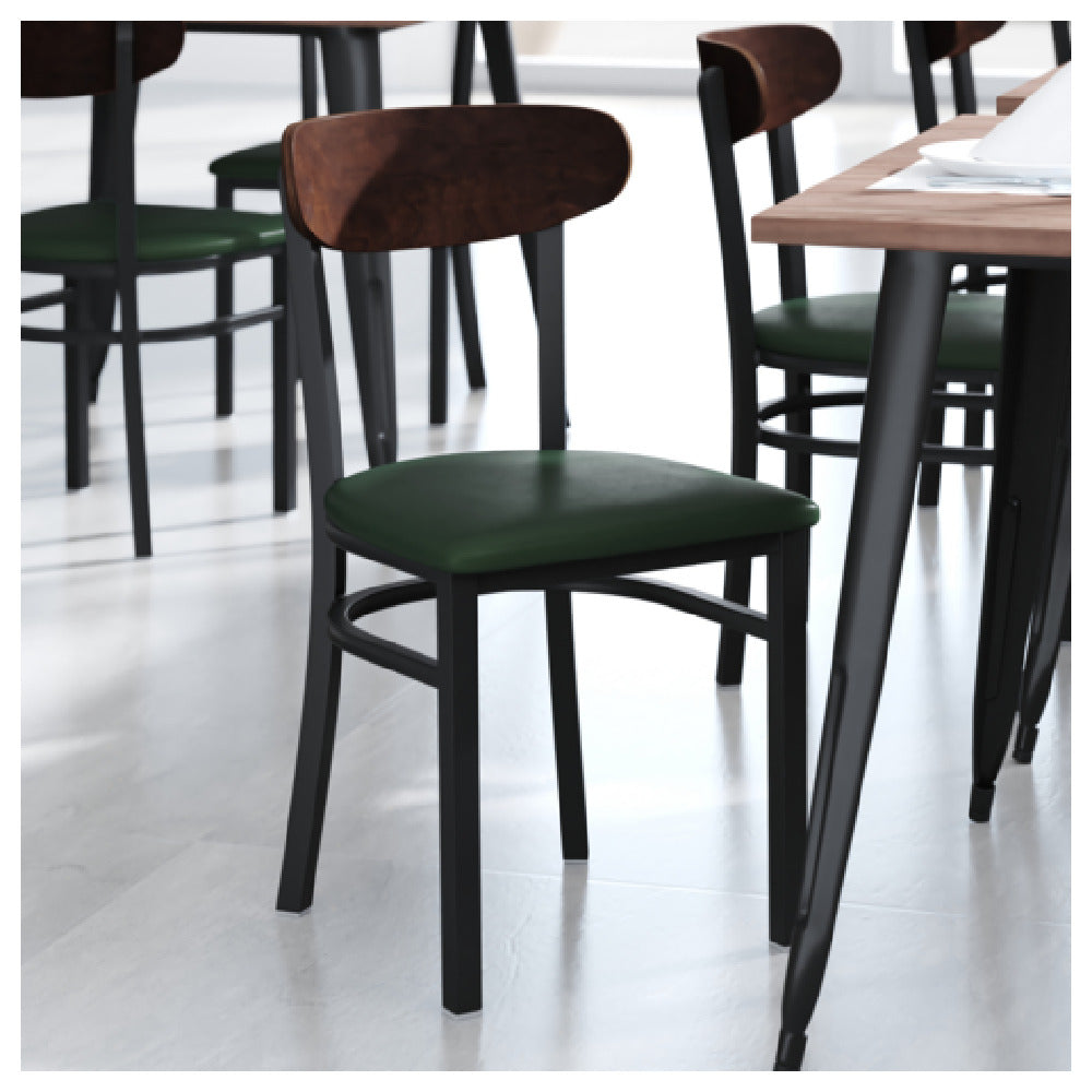The Flash Furniture XU-DG6V5GNV-WAL-GG Wright Dining Chair is engineered for durability and style, boasting a remarkable 500 lb. weight capacity that sets it apart in the realm of dining furniture. This chair features a green vinyl upholstered seat, combining comfort with an easy-to-clean surface, ideal for both residential and commercial settings. The wooden boomerang back not only adds a touch of elegance with its unique walnut finish but also provides ergonomic support, making it suitable for extended periods of use. An industrial-strength black steel frame enhances the chair's robustness, ensuring longevity even under heavy usage. This design incorporates fixed floor glides, which protect floors and allow for smooth movement, making it a practical choice for various flooring types. The walnut finish lends a classic aesthetic, seamlessly blending with diverse interior decors. Assembly is required, allowing for straightforward setup upon delivery. This chair is a versatile addition to any dining room, restaurant, or event space, meeting the demands of both style-conscious homeowners and business owners who prioritize function and form. Its exceptional weight capacity and thoughtful design make it an invaluable asset across multiple market segments, from hospitality to home dining.