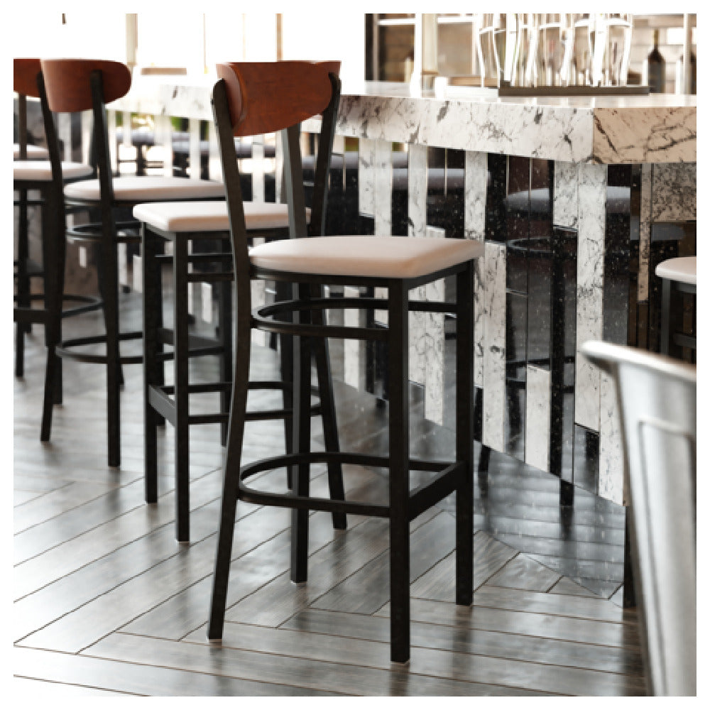 The Flash Furniture XU-DG6V6GYV-WAL-GG Wright Bar Stool is a highly durable seating solution with a substantial weight capacity of 500 lbs., making it suitable for various commercial environments, such as bars, restaurants, and cafes. This bar stool features a sophisticated gray vinyl upholstered seat, providing both comfort and style. Its design includes a wooden boomerang back that adds a unique aesthetic appeal, while the robust black steel frame ensures stability and longevity. For added convenience and user comfort, the stool is equipped with a lower bracing footrest. Fixed floor glides are included to protect your flooring and ensure smooth movement. The stool's walnut finish enhances its visual appeal, complementing a wide range of interior decors. Note that assembly is required, allowing for easy transport and installation. This versatile bar stool is designed to meet the demands of high-traffic areas, combining functionality with a modern design to enhance any space it occupies.