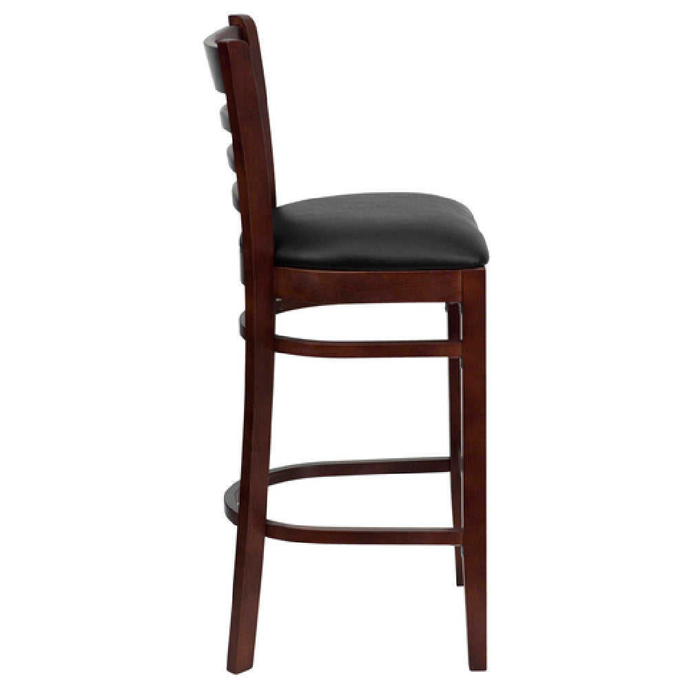 Flash Furniture XU-DGW0005BARLAD-MAH-BLKV-GG Hercules Series Restaurant Bar Stool is meticulously crafted for diverse hospitality settings, spotlighting its robust construction and aesthetic versatility. This stool features a wood ladder back design, providing both comfort and classic appeal, while the black vinyl upholstered padded seat ensures extended comfort with its 2-1/2" thick CA117 fire retardant foam. Its European beechwood frame, adorned with a rich mahogany finish, offers both strength and elegance, complemented by mortise and tenon style construction with metal wood screw reinforcements for enhanced durability. Two curved support bars and a footrest add structural stability and user comfort, making it an ideal choice for high-traffic commercial environments. The inclusion of plastic floor glides aids in protecting flooring surfaces, underscoring its suitability for various indoor settings. Engineered with practicality in mind, this stool requires assembly upon arrival, with in-stock items typically ready for shipment within 24 hours, ensuring a swift procurement process for businesses. Its design and materials make it a versatile seating solution that meets the rigorous demands of restaurant operations while maintaining aesthetic appeal.