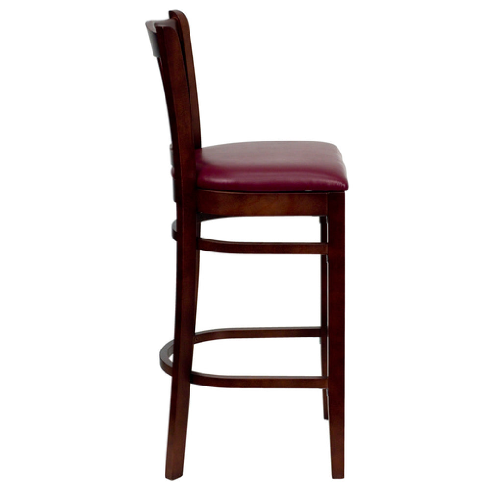 The Flash Furniture XU-DGW0008BARVRT-MAH-BURV-GG Hercules Series Restaurant Bar Stool is a well-crafted seating solution engineered for commercial environments. Featuring a vertical wood slat back, this stool combines classic design with functionality. The seat is upholstered in burgundy vinyl, padded with a substantial 2-1/2 inch thick CA117 fire retardant foam, ensuring both comfort and safety. Its construction utilizes mortise and tenon style joints reinforced with metal wood screws, enhancing the stool's durability and stability. The design includes two curved support bars and a footrest, providing additional support and comfort for users. Made from European beechwood, the frame is finished in a rich mahogany, adding a touch of elegance to any setting. This bar stool is equipped with plastic floor glides, protecting flooring surfaces from scratches and making movement easier. Primarily designed for commercial use, it requires assembly upon delivery, but items in stock typically ship within 24 hours. The combination of aesthetic appeal, robust construction, and practical features makes this bar stool a versatile choice suitable for restaurants, bars, and cafes looking to enhance their seating arrangements with a reliable and stylish option.