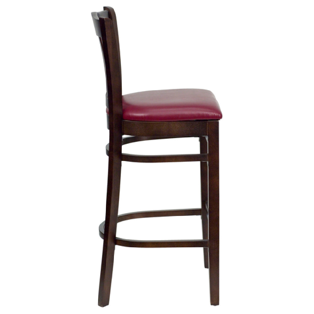 The Flash Furniture XU-DGW0008BARVRT-WAL-BURV-GG Hercules Series Restaurant Bar Stool is a meticulously crafted seating solution, designed to cater to the demanding environments of commercial establishments. Featuring a vertical wood slat back, this bar stool combines aesthetic appeal with functionality. The seat is upholstered in burgundy vinyl and padded with 2-1/2" thick CA117 fire retardant foam, ensuring comfort and safety. Constructed using the mortise and tenon style, reinforced with metal wood screws, it promises durability and stability. This bar stool includes two curved support bars and a footrest, enhancing user comfort and structural integrity. The frame is made of European beechwood, finished in walnut, offering a classic and elegant appearance. To protect flooring, the stool is equipped with plastic floor glides. Designed specifically for commercial use, this bar stool meets the rigorous demands of restaurant environments, while assembly is required upon purchase. Notably, in-stock items typically ship within 24 hours, ensuring quick delivery for businesses needing a reliable seating solution. The Flash Furniture Hercules Series Bar Stool is a perfect blend of style, comfort, and durability, making it a valuable choice for restaurant owners and operators seeking to enhance their dining spaces.