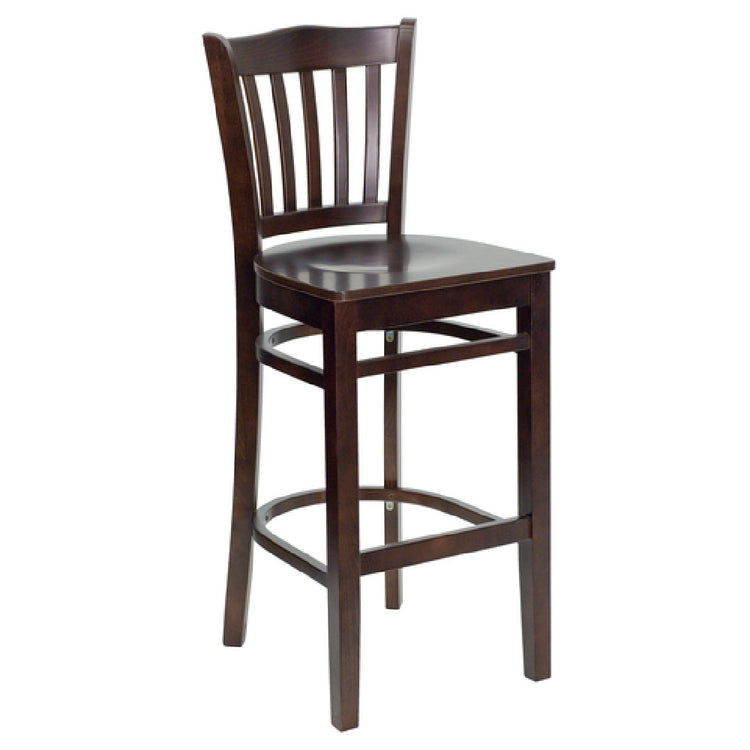The Flash Furniture XU-DGW0008BARVRT-WAL-GG Hercules Series Restaurant Bar Stool is a meticulously designed seating solution tailored for commercial environments. This bar stool features a vertical wood slat back that adds a classic and sophisticated appeal to any restaurant setting. The seat is crafted from 5/8-inch thick beechwood, finished in a rich walnut tone, which ensures both durability and aesthetic appeal. The stool's construction is robust, utilizing mortise and tenon joints reinforced with metal wood screws, enhancing its structural integrity. It is equipped with two curved support bars and a footrest that promote comfort and stability for patrons. The European beechwood frame, also finished in walnut, complements the overall design while ensuring longevity. Plastic floor glides are included to protect flooring from scratches, making it ideal for high-traffic commercial use. This bar stool requires assembly and, for businesses prioritizing swift turnaround, in-stock items typically ship within 24 hours. The Flash Furniture Hercules Series bar stool is a durable and stylish choice for restaurants aiming to provide a comfortable and reliable seating option for their guests, blending functionality with a timeless design.