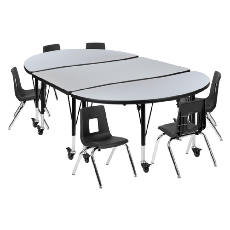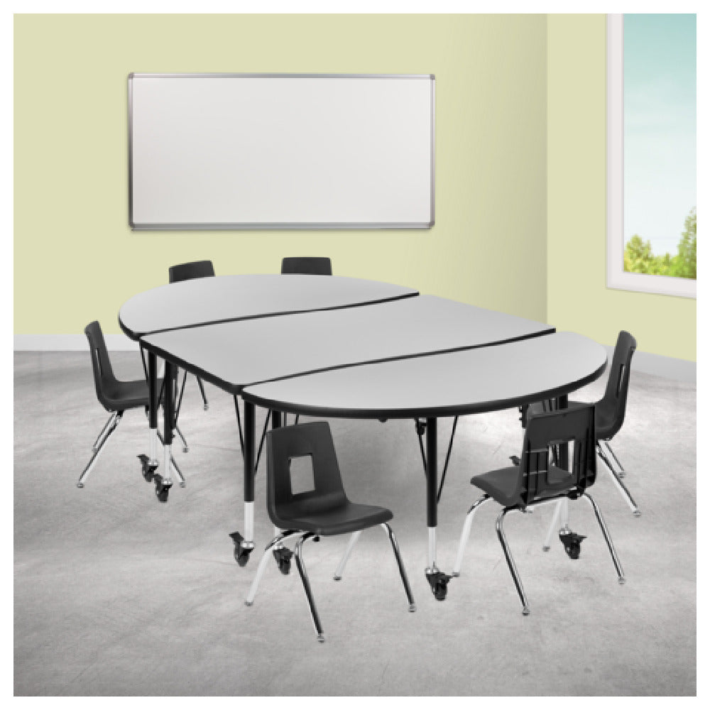 The Flash Furniture XU-GRP-12CH-A3048CON-48-GY-T-P-CAS-GG Emmy Activity Table and Chair Set is a versatile furniture solution designed to cater to various educational and informal settings. This set includes one oval table, measuring 76 inches wide by 47-1/2 inches deep and adjustable in height from 17 to 25 inches, making it suitable for a range of activities and user needs. The table boasts a durable laminate top, ensuring longevity and easy maintenance, while the 16-gauge tubular steel legs provide robust support. For enhanced mobility and stability, the table is equipped with locking casters, allowing easy repositioning across different spaces. Complementing the table are six stackable chairs, each with a 12-inch seat height, ideal for younger users in educational environments. The chairs and table feature a sleek nickel chrome-plated finish in a contemporary gray and black color scheme, adding a touch of modern elegance to any room. This table and chair set is particularly valuable for schools, daycare centers, and children's play areas, offering a practical and adaptable solution for collaborative activities and learning environments.