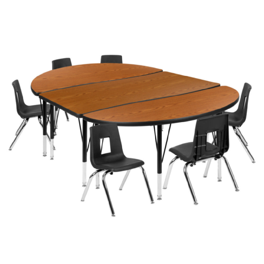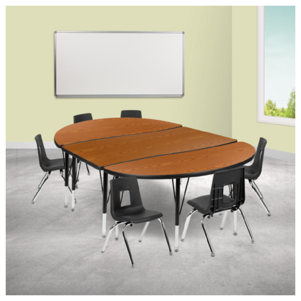 The Flash Furniture XU-GRP-12CH-A3048CON-48-OAK-T-P-GG Emmy Activity Table And Chair Set is an expertly designed furniture set that combines functionality with durability, catering to various educational and professional environments. This set includes a generously sized oval table measuring 76 inches in width and 47-1/2 inches in depth, with an adjustable height ranging from 16-1/4 inches to 25-1/4 inches, making it adaptable to different needs. The table features a durable laminate top supported by 16-gauge tubular steel legs, ensuring robust stability. Its nylon floor glides protect flooring surfaces and allow for easy movement. Complementing the table are six stackable chairs, each with a 12-inch seat height and a nickel chrome-plated finish, providing a sleek and modern appearance. The oak and black color scheme adds a classic touch to the set, making it aesthetically versatile for various settings. Designed for multipurpose use, this table and chair set is ideal for classrooms, conference rooms, and collaborative spaces, offering an efficient and practical solution for group activities and meetings. Its stackable chairs enhance space management, allowing for easy storage when not in use, while the robust construction ensures longevity and sustained usability.