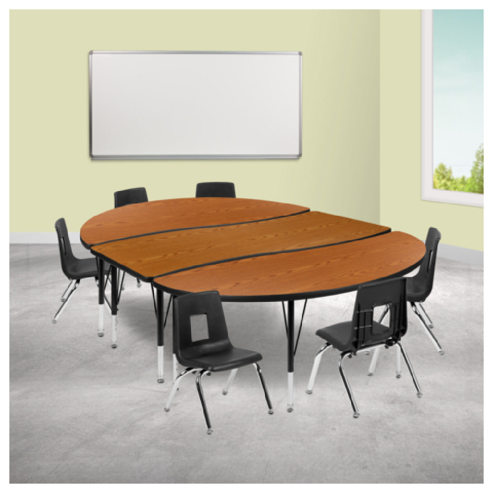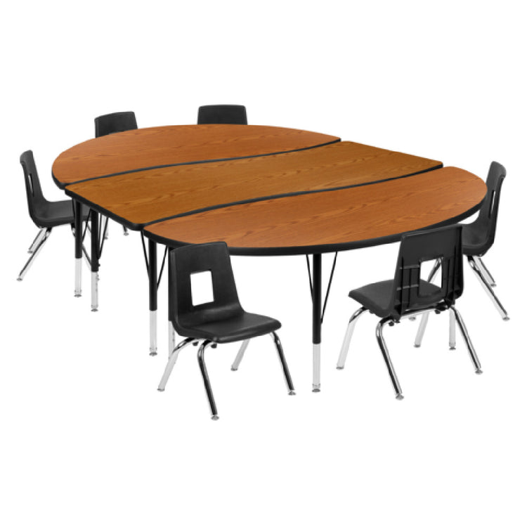 The Flash Furniture XU-GRP-12CH-A3060CON-60-OAK-T-P-GG Emmy Activity Table and Chair Set is a versatile and durable furniture solution ideal for educational environments and creative spaces. This set features a spacious oval table measuring 86 inches in width and 60 inches in depth, with an adjustable height ranging from 16-1/4 inches to 25-1/4 inches, catering to various user needs. The table is constructed with a laminate top, providing a smooth and easy-to-clean surface, complemented by robust 16-gauge tubular steel legs for enhanced stability and strength. Nylon floor glides are included to protect flooring and ensure easy movement. The set comes with six stackable chairs, each with a 12-inch seat height, making it suitable for younger users in educational settings. The chairs feature a nickel chrome plated finish, adding a touch of style while ensuring durability. The oak and black color combination provides a classic aesthetic that can seamlessly integrate into diverse environments. The Emmy Activity Table and Chair Set offers a practical and reliable option for schools, daycare centers, and activity rooms, emphasizing functionality and adaptability within the industry.