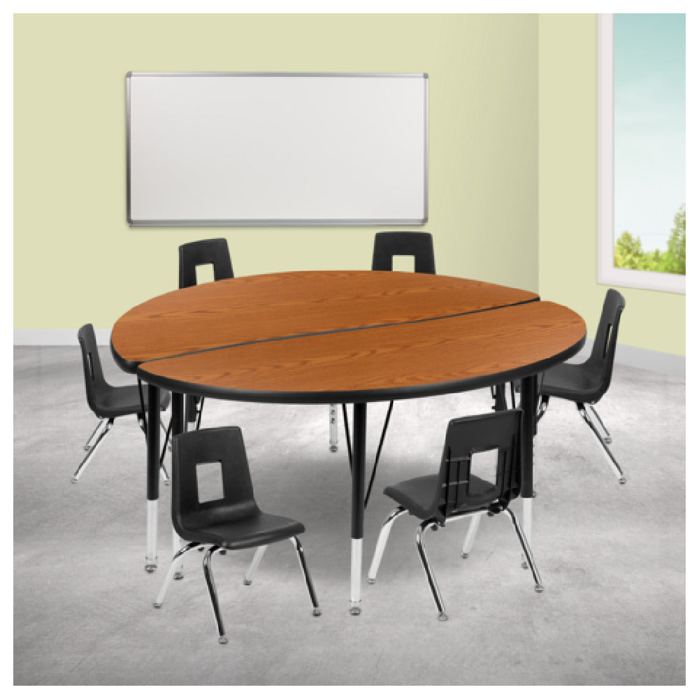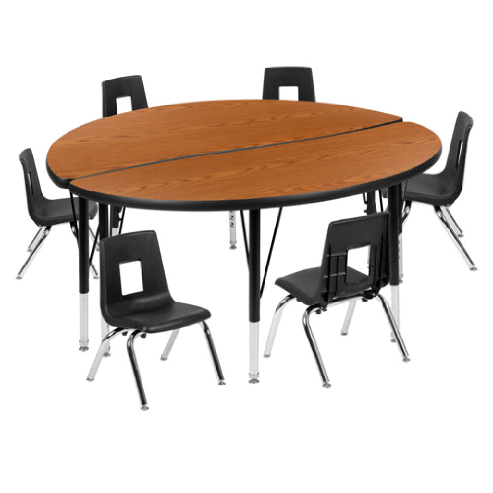 The Flash Furniture XU-GRP-12CH-A48-HCIRC-OAK-T-P-GG Emmy Activity Table and Chair Set is a versatile seating solution ideal for educational and recreational environments. The set includes a round table with a diameter of 48 inches, featuring a laminate top that offers durability and ease of maintenance. Its height is adjustable, ranging from 16-1/4 inches to 25-1/4 inches, accommodating various activities and user needs. The table is supported by 16-gauge tubular steel legs, ensuring a sturdy and stable construction, while nylon floor glides protect surfaces from scratches. Complementing the table are six stack chairs, each with a seat height of 12 inches, making them suitable for young users. The chairs feature a nickel chrome-plated finish, adding a sleek look to the set. The oak and black color scheme provides a classic aesthetic that fits seamlessly into different settings. This activity table and chair set is designed for flexibility and functionality in classrooms, playrooms, and community centers, offering a reliable and stylish solution for diverse seating needs.