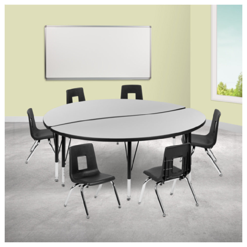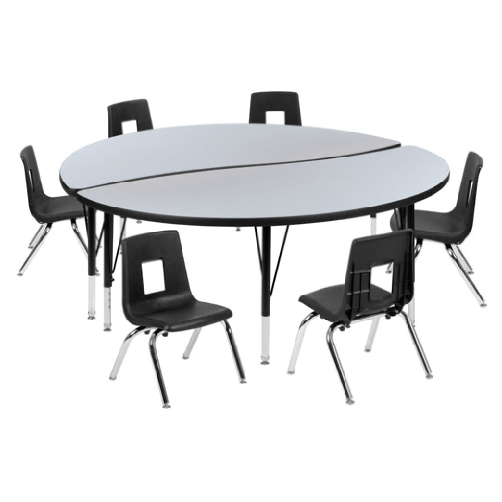 The Flash Furniture XU-GRP-12CH-A60-HCIRC-GY-T-P-GG Emmy Activity Table and Chair Set is a versatile and durable piece designed for educational and creative environments. At its core is a 60-inch diameter round table, which features a laminate top supported by sturdy 16-gauge tubular steel legs, ensuring exceptional stability and resilience. The table's height is adjustable from 16-1/4 inches to 25-1/4 inches, accommodating various age groups and activities. Complementing the table are six stackable chairs, each with a 12-inch seat height, crafted for comfort and easy storage. The chairs and table are finished in an elegant gray and black color scheme, with nickel chrome plating adding a touch of modern sophistication. Nylon floor glides on the table's legs protect flooring surfaces from scratches, making this set a practical choice for classrooms, daycare centers, and multi-purpose rooms. The Flash Furniture Emmy Activity Table and Chair Set provides a flexible and reliable solution for engaging group activities, tailored to meet the diverse needs of educational institutions and organizations seeking durable, high-quality furniture. Its thoughtful design promotes collaborative learning while ensuring a long-lasting investment in any educational setting.