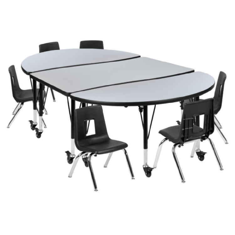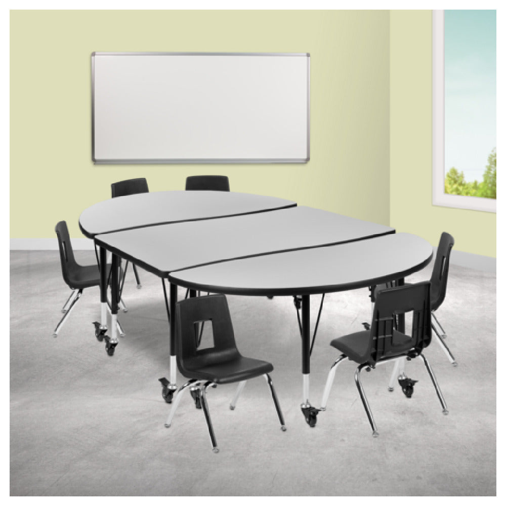 The Flash Furniture XU-GRP-14CH-A3048CON-48-GY-T-P-CAS-GG Emmy Activity Table and Chair Set is designed for versatile use in educational and creative environments. This set includes a generously sized oval table with dimensions of 76 inches in width, 47-1/2 inches in depth, and a height adjustable from 17 to 25 inches. The table features a durable laminate top supported by 16-gauge tubular steel legs, ensuring stability and longevity. Its locking casters allow for easy mobility and secure placement within any space. Complementing the table are six stackable chairs, each with a 14-inch seat height, making them suitable for young learners. The nickel chrome plated finish of the table and chairs adds a sleek and modern aesthetic to any setting. This set's gray and black color scheme ensures it fits seamlessly into a variety of decor styles. Whether used in a classroom, art studio, or community center, the Flash Furniture Emmy Activity Table and Chair Set provides a practical and stylish solution for collaborative activities, fostering an engaging and adaptable learning environment. Its robust construction and thoughtful design cater to the diverse needs of educational institutions and creative spaces alike.
