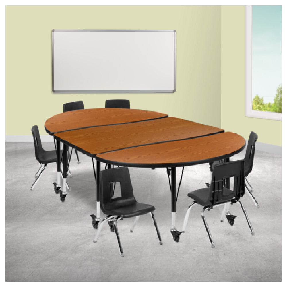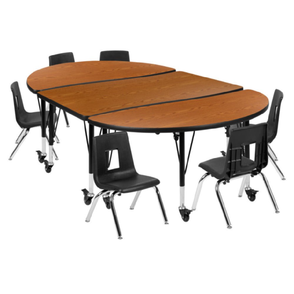 The Flash Furniture XU-GRP-14CH-A3048CON-48-OAK-T-P-CAS-GG Emmy Activity Table And Chair Set is a meticulously designed ensemble catering to a variety of settings, combining functionality with durability. This set includes a spacious oval table measuring 76 inches in width, 47-1/2 inches in depth, and adjustable height between 17 and 25 inches, providing versatility for different activities and user needs. The table features a durable laminate top supported by sturdy 16-gauge tubular steel legs, ensuring stability and long-lasting use. Additionally, the locking casters attached to the table offer easy mobility, allowing seamless rearrangement in dynamic environments such as classrooms, training facilities, or collaborative workspaces. Complementing the table are six stack chairs, each with a 14-inch seat height, crafted for comfort and ease of storage. The chairs' nickel chrome-plated finish and oak/black color scheme add a sophisticated touch to the setting, enhancing the aesthetic appeal. The Emmy Activity Table And Chair Set is a practical solution for educational institutions, corporate training rooms, or creative studios, offering a blend of robust construction and user-centric design that addresses the needs of various market segments within its industry.