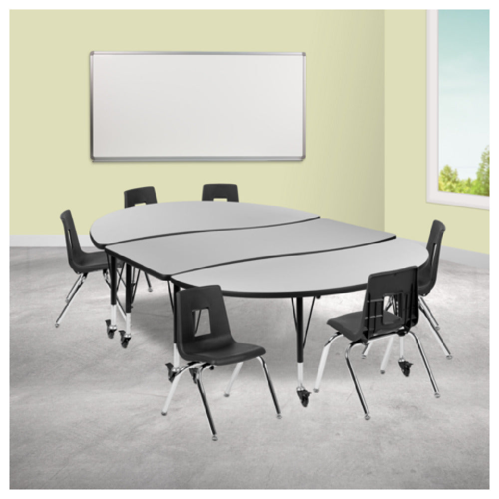 The Flash Furniture XU-GRP-14CH-A3060CON-60-GY-T-P-CAS-GG Emmy Activity Table and Chair Set is a versatile solution designed to cater to various educational and professional environments. This set includes a spacious oval table measuring 86 inches in width, 60 inches in depth, and adjustable in height from 17 to 25 inches, making it adaptable for different uses and age groups. The table features a durable laminate top supported by 16-gauge tubular steel legs, ensuring robustness and longevity. The addition of locking casters enhances mobility, allowing easy repositioning within a space, while also providing stability when locked in place. Complementing the table are six stackable chairs, each with a 14-inch seat height, designed for ergonomic comfort. The set's aesthetic is completed with a nickel chrome-plated finish in a sophisticated gray and black color scheme, lending a modern touch to any setting. This combination of practicality, durability, and style makes the Emmy Activity Table and Chair Set ideal for classrooms, collaborative workspaces, and other environments where adaptable and reliable furniture is necessary.