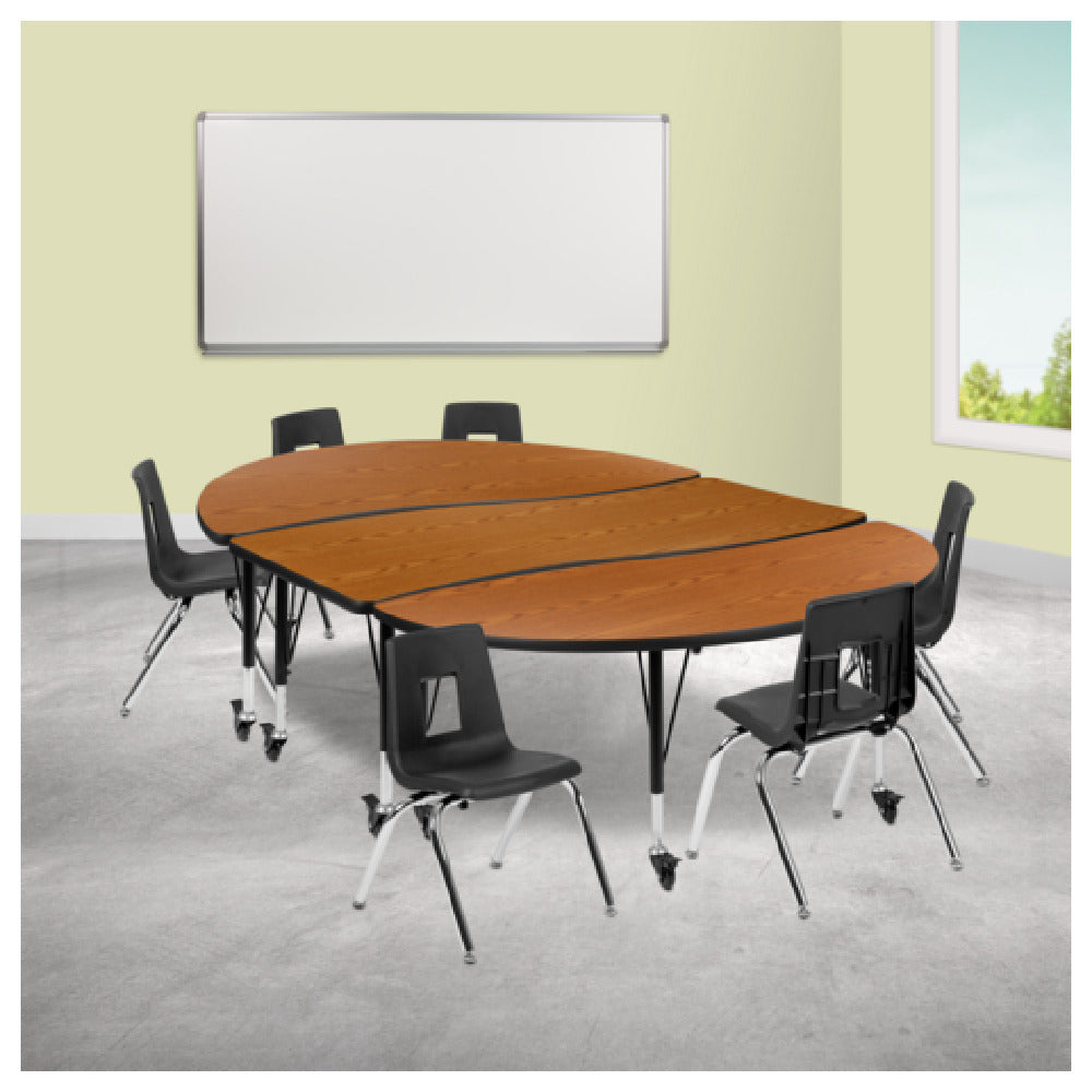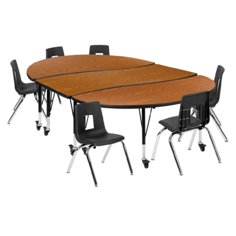 The Flash Furniture XU-GRP-14CH-A3060CON-60-OAK-T-P-CAS-GG Emmy Activity Table And Chair Set is engineered to provide a versatile and robust solution for various educational and collaborative environments. This set includes one expansive table measuring 86 inches in width, 60 inches in depth, and adjustable in height from 17 to 25 inches, featuring an oval-shaped laminate top that offers both durability and a sleek appearance. The table's 16 gauge tubular steel legs ensure stability, and the locking casters facilitate easy mobility while maintaining secure placement during use. Complementing the table are six stackable chairs, each with a seat height of 14 inches, designed to accommodate young learners comfortably. The set boasts a nickel chrome plated finish that enhances its visual appeal and provides a layer of protection against wear and tear. With its oak and black color scheme, this activity table and chair set seamlessly integrates into various settings, from classrooms to training facilities. Its thoughtful design and quality materials make it a reliable choice for institutions seeking a balance of functionality, aesthetics, and adaptability.