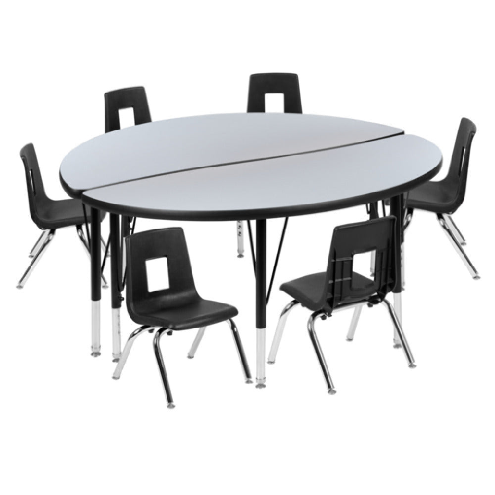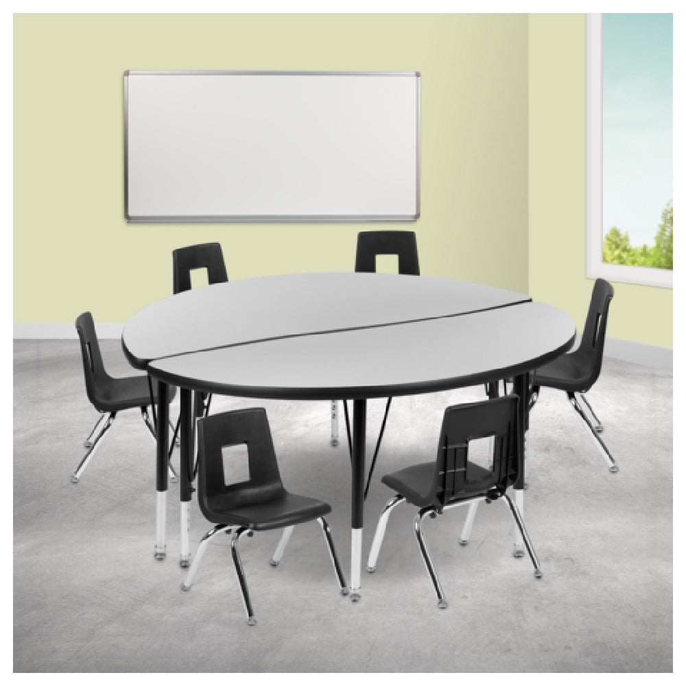 The Flash Furniture XU-GRP-14CH-A48-HCIRC-GY-T-P-GG Emmy Activity Table and Chair Set is designed to cater to a wide range of environments, ideal for educational, collaborative, or creative settings. This set includes one round table measuring 48 inches in diameter, with an adjustable height range of 16-1/4 to 25-1/4 inches. The table boasts a durable laminate top supported by 16-gauge tubular steel legs, ensuring stability and longevity. Nylon floor glides are featured on the legs to protect flooring surfaces and facilitate easy movement. Accompanying the table are six stackable chairs, each with a seat height of 14 inches, providing comfort for users. The chairs and table feature a sleek nickel chrome-plated finish in a stylish gray and black color scheme, offering a modern aesthetic. This versatile set is suitable for various segment markets, from schools and daycare centers to art studios and community spaces. Its robust construction and practical design make it a distinctive choice for those seeking reliable and flexible furniture solutions. The Flash Furniture Emmy Activity Table and Chair Set effectively combines functionality with contemporary style, meeting the needs of diverse user groups while enhancing any environment it inhabits.