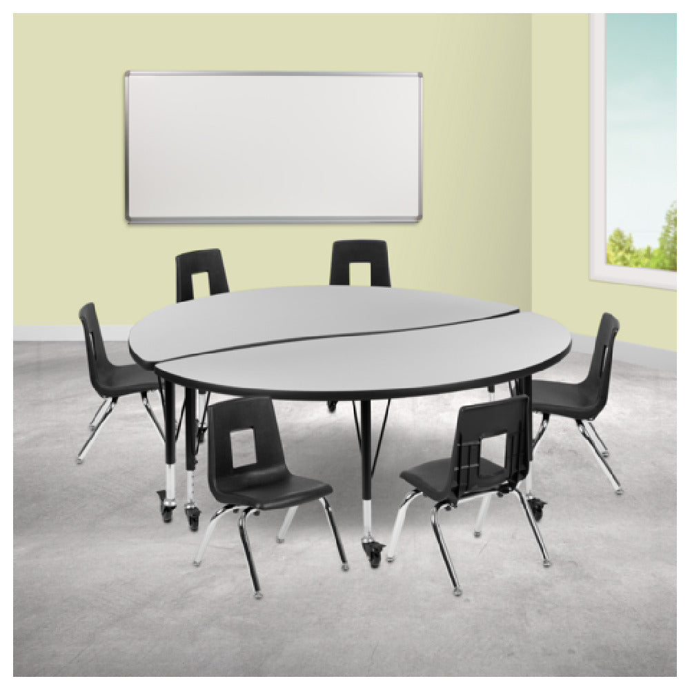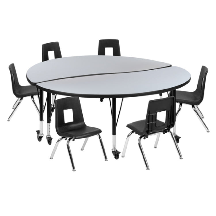The Flash Furniture XU-GRP-14CH-A60-HCIRC-GY-T-P-CAS-GG Emmy Activity Table and Chair Set is a versatile and robust solution designed for various educational and professional environments. This set includes a 60-inch diameter round table with an adjustable height ranging from 17 to 25 inches, catering to different user preferences and ergonomic needs. The table's laminate top is supported by durable 16-gauge tubular steel legs, ensuring stability and longevity. An added feature is the locking casters, which provide mobility and ease of repositioning for dynamic spaces. Accompanying the table are six stack chairs, each with a 14-inch seat height, making them suitable for young learners or spaces where compact seating is essential. The chairs and table share a nickel chrome plated finish, offering a sleek and modern aesthetic that complements the gray/black color scheme. This activity table and chair set is ideal for classrooms, training rooms, and collaborative workspaces, delivering a practical and aesthetically pleasing furniture solution that meets various functional demands within the industry. The combination of high-quality materials and thoughtful design elements makes this set a valuable asset in settings that require durable and adaptable furniture.