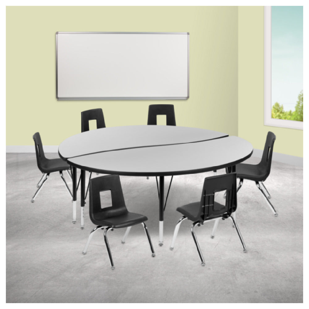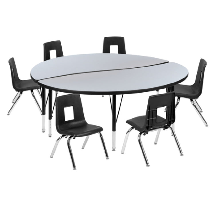 The Flash Furniture XU-GRP-14CH-A60-HCIRC-GY-T-P-GG Emmy Activity Table And Chair Set is a versatile and robust solution for educational and recreational environments. This set includes one round table with a diameter of 60 inches and an adjustable height ranging from 16-1/4 inches to 25-1/4 inches, designed with a durable laminate top that is ideal for various activities and tasks. The table is supported by 16-gauge tubular steel legs, ensuring strength and stability, and is equipped with nylon floor glides to protect flooring surfaces. Complementing the table are six stackable chairs, each featuring a 14-inch seat height, making them suitable for children and adaptable for different age groups and settings. The chairs and table legs boast a nickel chrome-plated finish, enhancing both durability and aesthetic appeal. The gray and black color scheme provides a modern and neutral appearance that fits seamlessly into diverse environments, from classrooms to playrooms. This set offers a practical and attractive furniture solution with flexible configuration options, making it an excellent choice for institutions seeking a reliable and stylish activity setup.