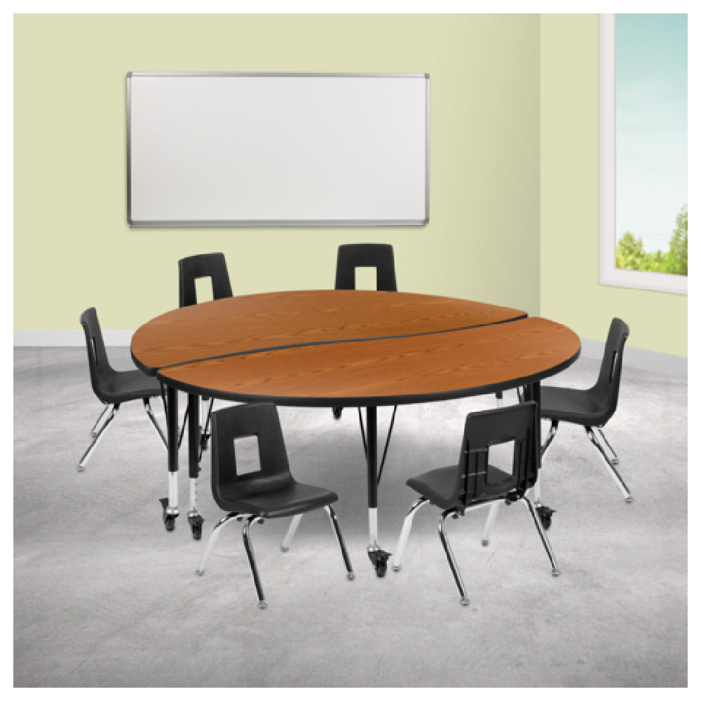 The Flash Furniture XU-GRP-14CH-A60-HCIRC-OAK-T-P-CAS-GG Emmy Activity Table and Chair Set is a versatile and robust solution designed for a variety of educational and recreational environments. This set includes a 60-inch diameter round table with an adjustable height ranging from 17 to 25 inches. The table features a durable laminate top and 16-gauge tubular steel legs, ensuring stability and longevity. Equipped with locking casters, the table offers smooth mobility and secure positioning, catering to dynamic classroom or activity needs. Accompanying the table are six stack chairs, each with a 14-inch seat height, suitable for young students. The chairs feature a nickel chrome plated finish, enhancing their durability and aesthetic appeal. The oak and black color scheme provides a classic yet contemporary look, making it adaptable to diverse interior styles. This set is ideal for schools, daycare centers, and community hubs seeking functional, reliable, and stylish furniture solutions that promote interaction and learning. Its combination of quality materials and thoughtful design makes the Emmy Activity Table and Chair Set a valuable asset for any active learning environment.