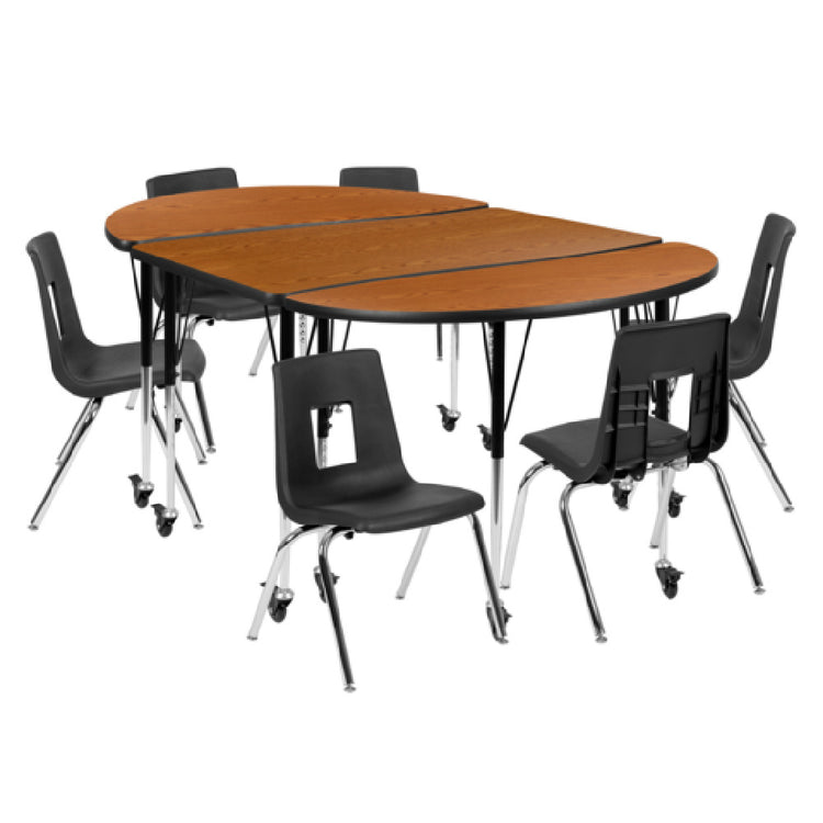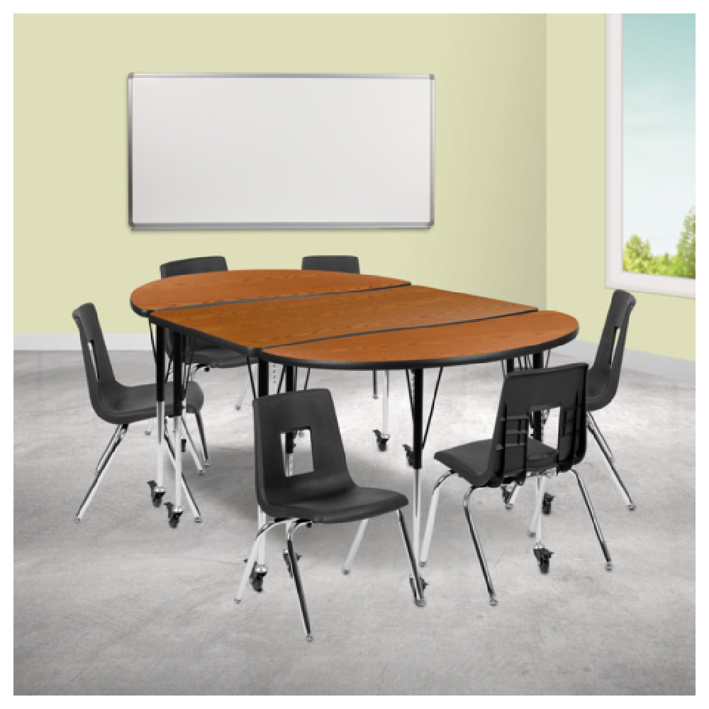 The Flash Furniture XU-GRP-16CH-A3048CON-48-OAK-T-A-CAS-GG Emmy Activity Table and Chair Set is an expertly designed furniture ensemble, perfect for a variety of educational and collaborative environments. This set features a substantial oval table measuring 76 inches wide, 47-1/2 inches deep, and adjustable in height from 17 to 25 inches, offering flexibility and adaptability to different settings. The table is constructed with a durable laminate top, ensuring long-lasting performance and resistance to wear. Its 16-gauge tubular steel legs provide robust support, and with locking casters, the table can be easily transported and secured in place when needed. Accompanying the table are six stackable chairs, each with a 16-inch seat height, crafted to provide comfort in extended use scenarios. These chairs feature a nickel chrome-plated finish, complementing the oak and black color scheme of the entire set. The Emmy Activity Table and Chair Set is ideally suited for use in schools, training rooms, and other multi-purpose spaces where durability, flexibility, and aesthetics are important. This thoughtfully designed set not only meets functional needs but also enhances the visual appeal of any room it occupies.