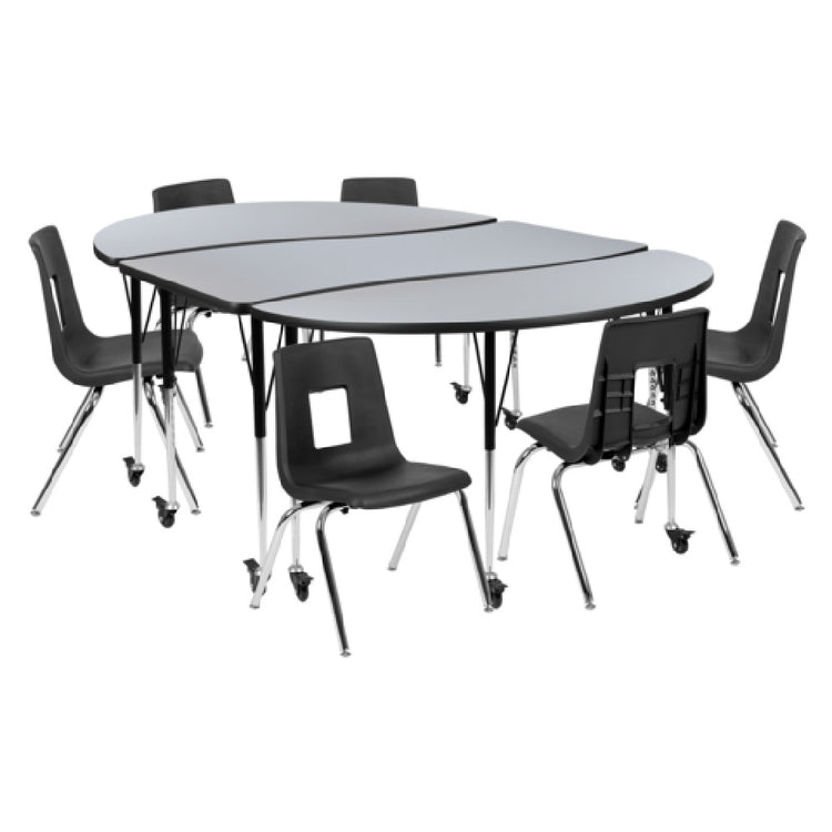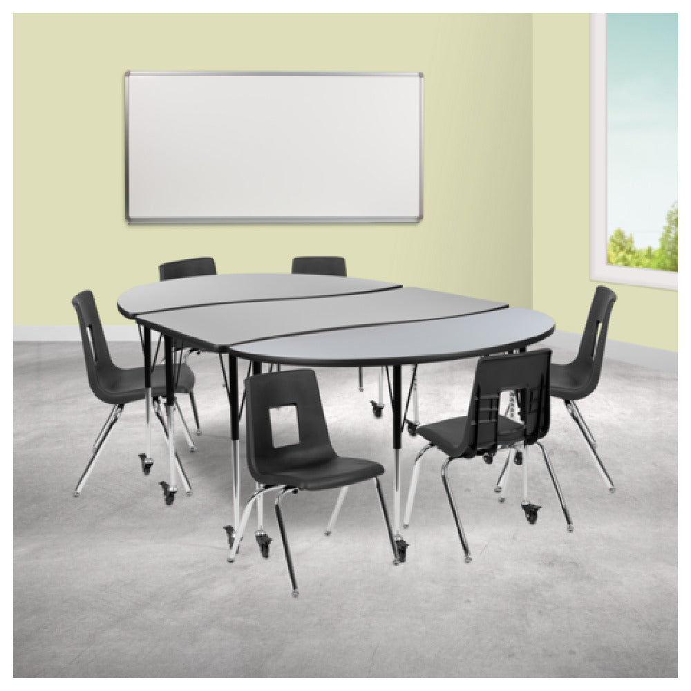 The Flash Furniture XU-GRP-16CH-A3060CON-60-GY-T-A-CAS-GG Emmy Activity Table and Chair Set is a versatile and durable furniture solution designed to meet the needs of various environments, such as educational settings, collaborative workspaces, and creative studios. This set features a large oval table measuring 86 inches in width, 60 inches in depth, and adjustable in height from 17 to 25 inches, offering ample space for multiple users. The table is equipped with a sturdy laminate top and supported by 16-gauge tubular steel legs, providing exceptional stability and strength. For added convenience and mobility, the table is fitted with locking casters, allowing for easy relocation and secure positioning. Accompanying the table are six stack chairs, each with a 16-inch seat height, designed for comfort and ease of storage when not in use. The set boasts a sleek gray and black color scheme, with a nickel chrome-plated finish that enhances its modern aesthetic while ensuring resistance to wear and tear. This combination of functional design, robust construction, and flexible usage makes the Emmy Activity Table and Chair Set an excellent choice for diverse applications, catering to the varying demands of different segment markets within the industry it serves.