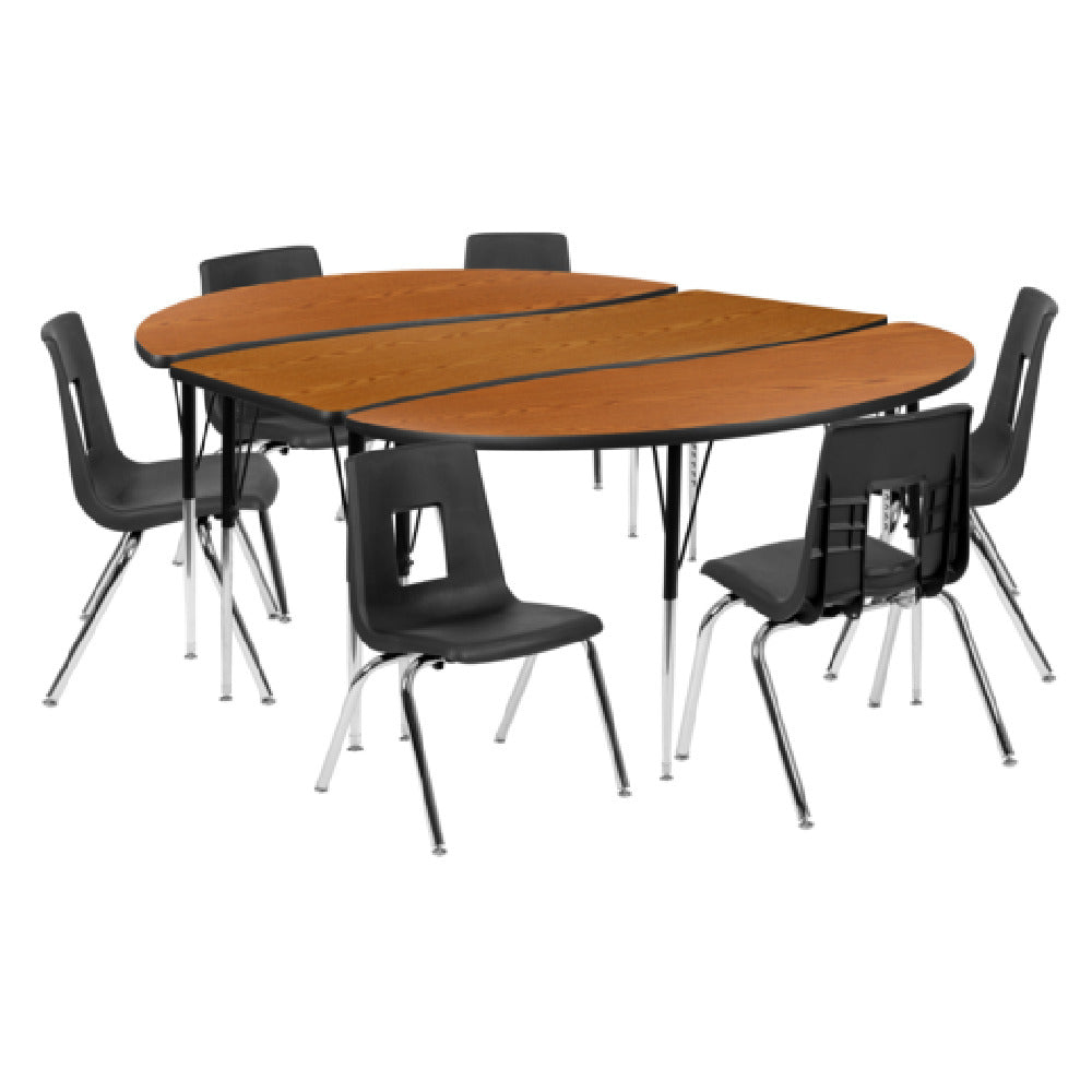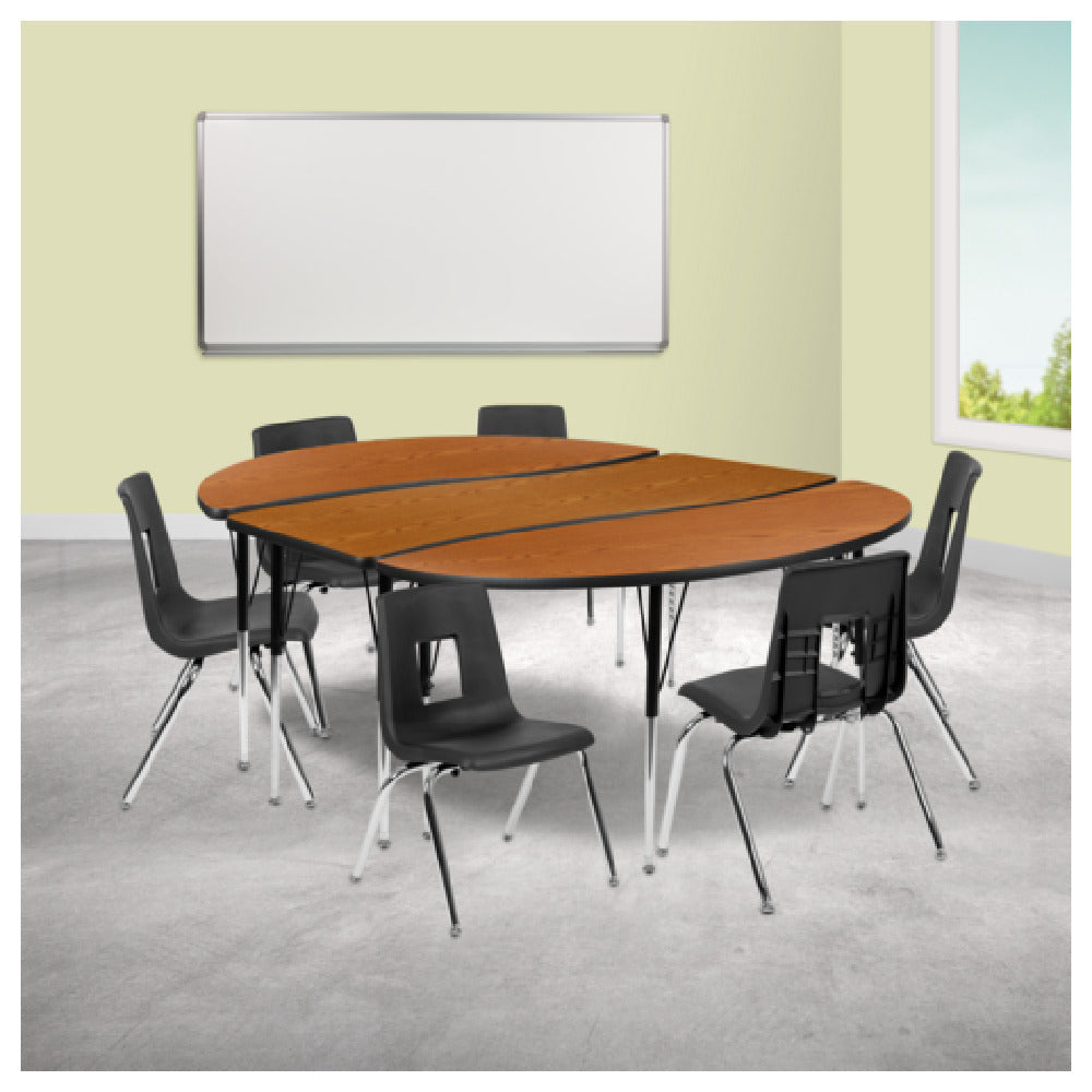 The Flash Furniture XU-GRP-16CH-A3060CON-60-OAK-T-A-GG Emmy Activity Table And Chair Set is an adaptable and robust addition to any educational or recreational space. This set features an 86-inch wide by 60-inch deep table, with an adjustable height range of 16-1/4 to 25-1/4 inches, making it suitable for various activities and user needs. The table's oval top is crafted from durable laminate, providing a smooth and easy-to-clean surface ideal for classrooms, play areas, or collaborative workspaces. Supported by 16-gauge tubular steel legs, the table ensures stability and longevity, complemented by nylon floor glides that protect flooring and allow for easy repositioning. Accompanying the table are six stackable chairs, each with a 16-inch seat height, designed for comfort and ease of storage. The set's nickel chrome-plated finish adds a sleek, modern aesthetic, while the oak and black color scheme offers a versatile look that integrates seamlessly into diverse environments. This Emmy Activity Table And Chair Set is perfect for educational institutions, community centers, or offices seeking a functional and fashionable furniture solution that supports diverse activities and enhances productivity.